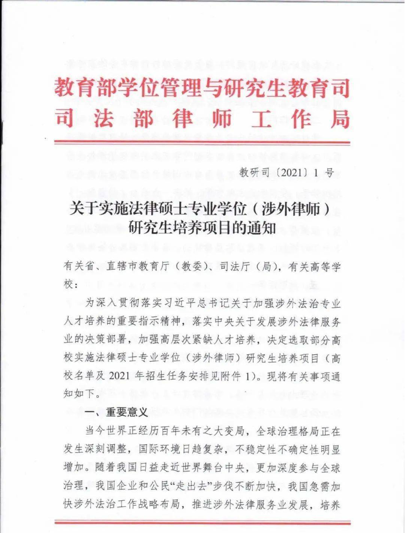 2月4日,教育部学位管理与研究生教育司、司法部律师工作局联合下发《关于实施法律硕士专业学位(涉外律师)研究生培养项目的通知》。通知指出:“为深入贯彻落实关于加强涉外法治专业人才培养的重要指示精神,加强高层次紧缺人才培养,决定选取部分高校实施法律硕士专业学位(涉外律师)研究生培养项目。”