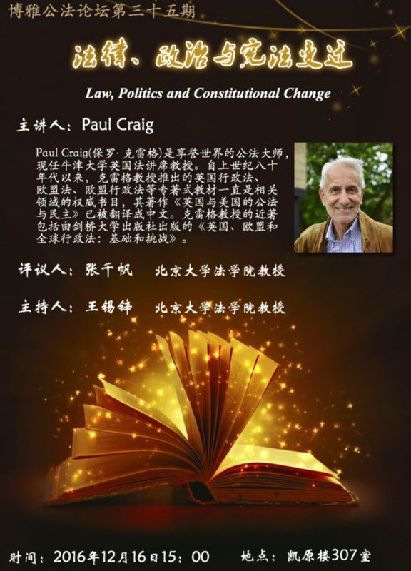 〔讲座简介〕2016年是全球范围内宪法制度的多事之秋。从英国公投脱离欧盟,到美国总统选举之争,再到意大利修宪公投失败,多个重大历史事件纷至沓来,法律与政治之纠缠互动令人目不暇接。怎样理解这些撼动西方秩序的宪法变迁,又如何把握与应对其间浮现的机遇和挑战,且听克雷格教授深度解析。讲座将提供交传翻译,欢迎各位老师、同学积极参与!