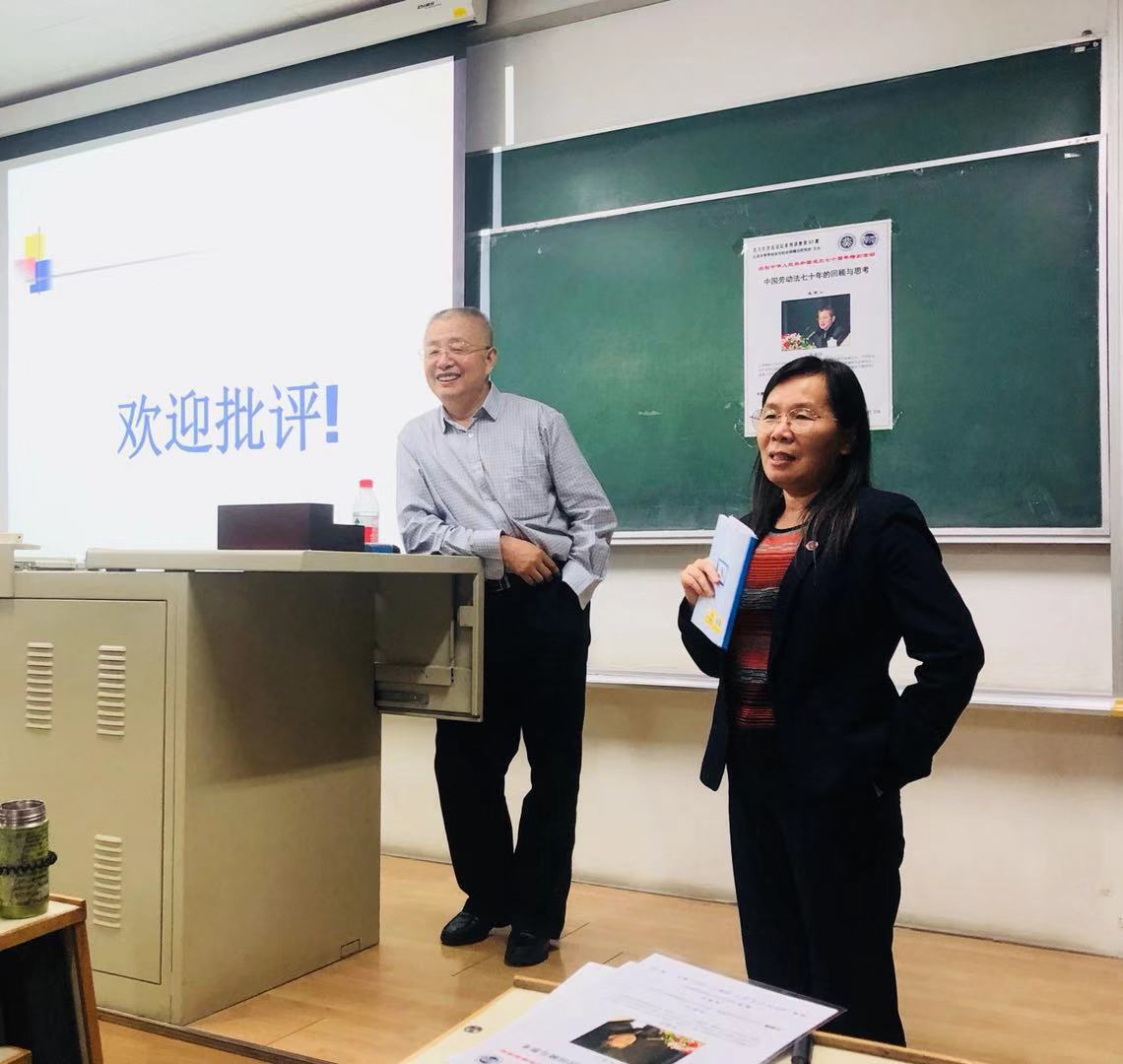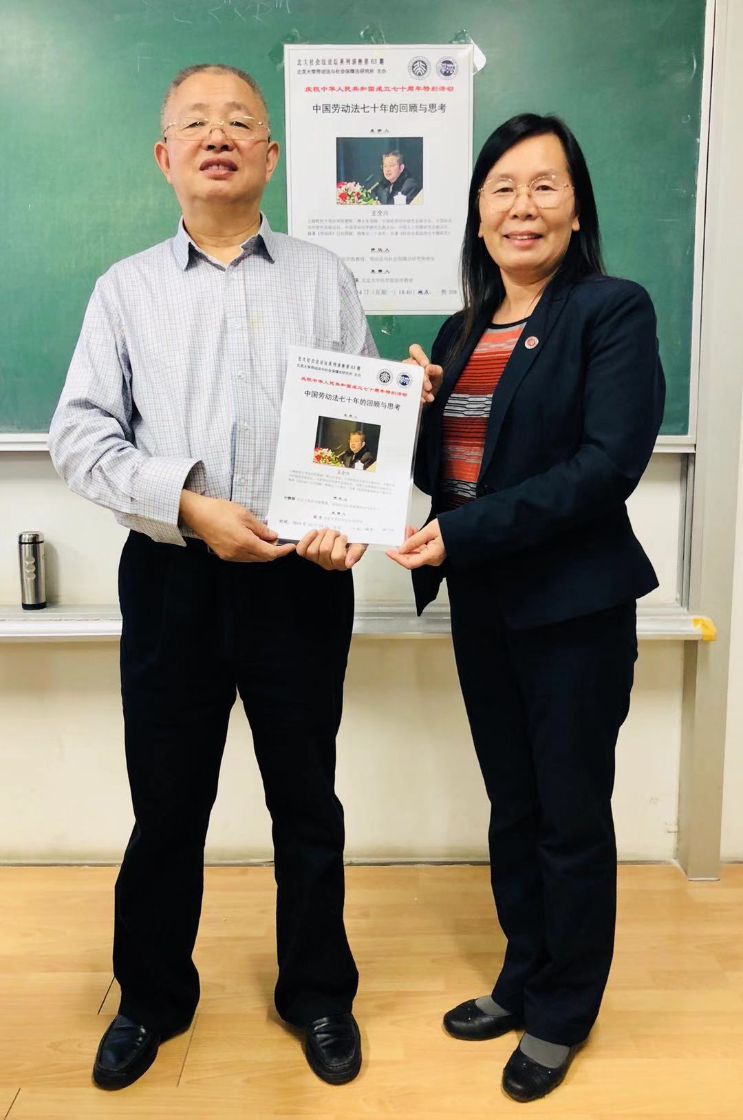 王全兴教授的讲座完成后,叶静漪教授发表与谈观点。叶老师指出,王全兴教授的讲座视野开阔,气象宏大,展现了中国社会法学的学术水准,是一场精心准备的思想盛宴。王老师特别注重将制度发展与每一时代的社会经济背景结合起来,梳理其脉络,剖析其因果,彰显了劳动法与我国社会主义改革和建设事业同呼吸、共命运的历史特点。中国劳动法的发展需要多方面的努力,可做、要做的事情还有很多,而劳动法学的研究负有助力法治发展的历史使命。叶老师还主持学生向王老师提问,并向王老师赠送讲座海报留念。