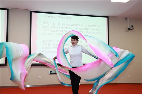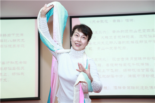 令人惊喜的是,袁教授现场为大家演唱了《梨花颂》,柔婉动人,丝丝入扣,过耳难忘,若非置身现代化的教室,几乎飘飘欲仙,仿佛亲见杨贵妃入梦,如叹如诉,长恨一曲回味悠长。