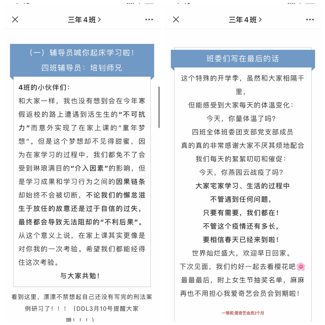 疫情发生以来,beat365亚洲版官网2019级法律硕士(非法学)第4党、团支部始终“离校不离线”,积极响应总书记号召,充分发挥基层党团组织凝聚人心、服务青年的作用,以支部公众号“三年四班” 为平台,开展“凝聚青春力量,携手抗击疫情——‘四’海同心,4班在行动”系列活动,在班级、学院层面起到了广泛带动作用。
