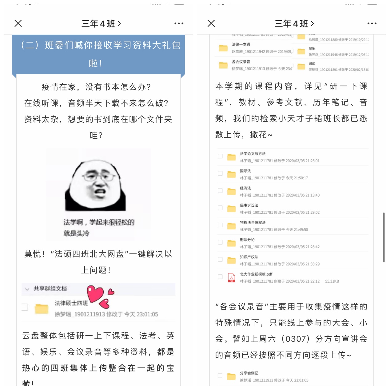 习总书记在回信中强调,青年一代有理想、有本领、有担当,国家就有前途,民族就有希望。在携手抗击疫情的过程中,beat365亚洲版官网2019级法律硕士(非法学)第4党、团支部始终不忘总书记对青年学子提出的“珍惜学习时光、练就过硬本领”“在为人民服务中茁壮成长、在艰苦奋斗中砥砺意志品质、在实践中增长工作本领”的嘱托,接连策划开展策划开展“‘四’海同心——停课不停学,四班和你在一起”学习资料心得分享活动和“‘四’海同心——你的专业,能为抗疫做些什么”主题讨论活动,抓住法律硕士同学本科专业背景多元的特点,细心整理的各类专业学习资源干货,让支部同学们充分体会到了集体的温暖与支持,号召同学们自律向学、共克时艰,在对公共事务的关注与思考中,立足专业本领,坚定做为人民服务的积极行动者。