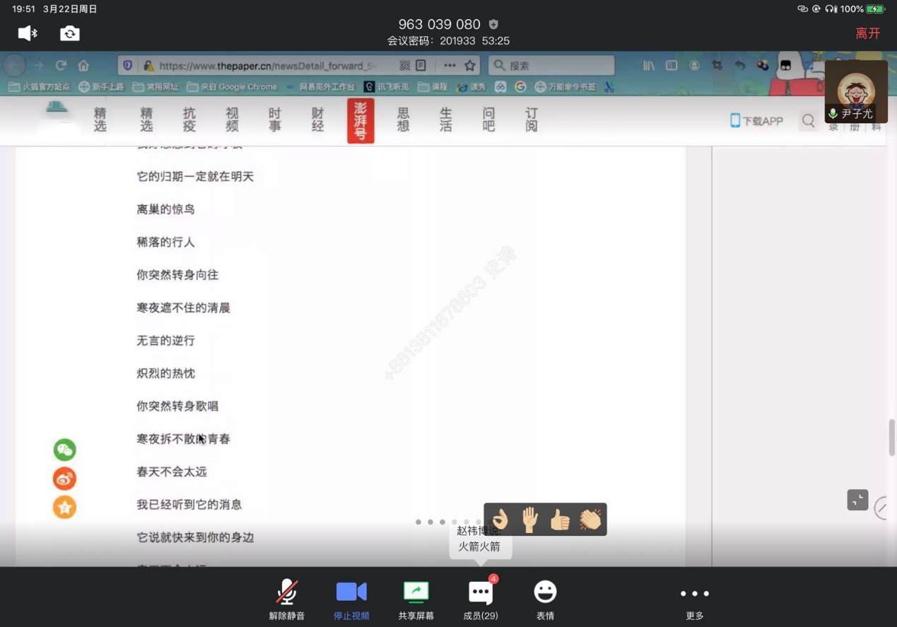 尹子尤同学结合自己参与学院防疫信息报送工作和学校抗疫原创歌曲创作的体验,向大家讲述了自己从国庆重大活动到新冠疫情防控中所一脉相承延续践行的责任感和荣誉感,并在线连麦演唱了抗疫原创校园歌曲《春天不会太远》,引发同学们一波点赞刷屏。