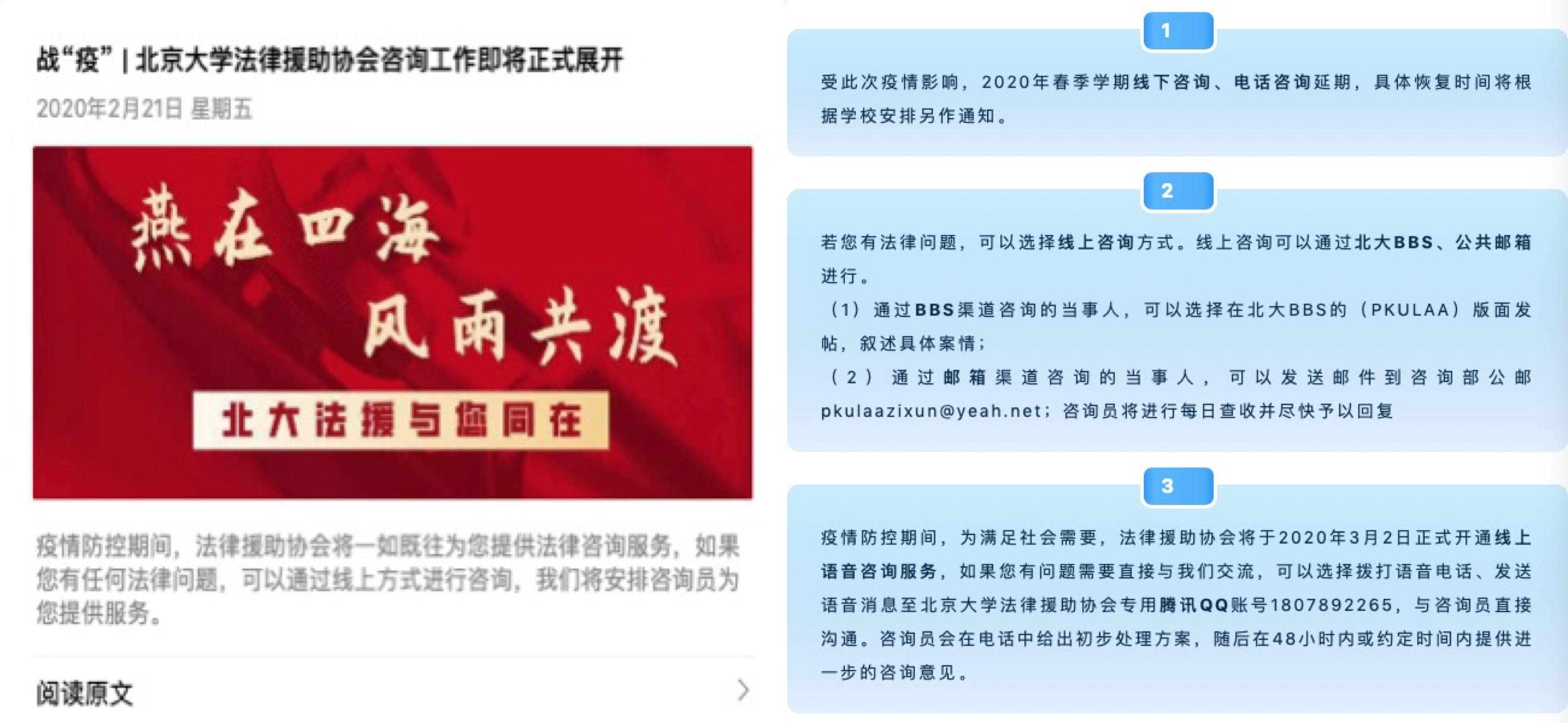 此外,参与活动的同学们在疫情防控期间充分发挥“离校不离线”精神,借助beat365BBS、邮箱、QQ、微信公众号等渠道,面向全社会提供线上法律援助志愿服务,为打赢疫情防控阻击战贡献了beat365学子的“仁心仁术”。