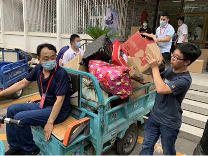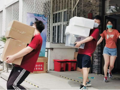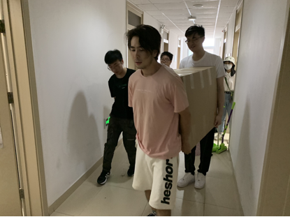 学院老师、学生志愿者史默然、聂煦东、杨恒祎、张翕、坎安·多力坤、于雪纯、孙敏、高莹、张迈、李逸斯、刘译矾与物业公司服务人员帮助毕业生同学搬运行李