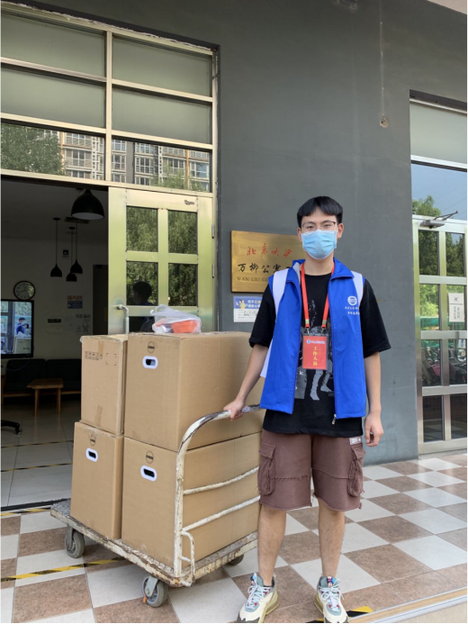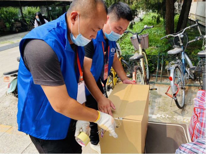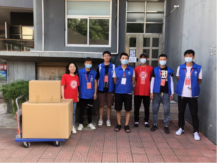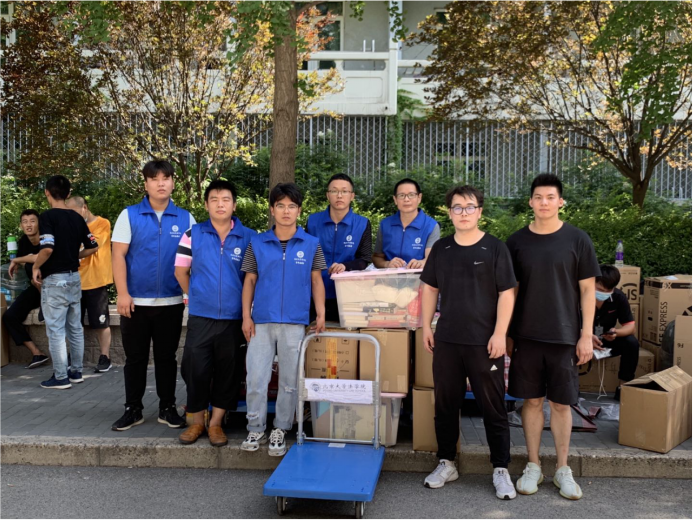 beat365亚洲版官网学生志愿者李天浩、于雪纯、刘颖、吕可欣、姜聪、李红、杨杉、姚建伟、闫淳溪等同学参与行李打包、搬运,后勤保障等志愿服务工作