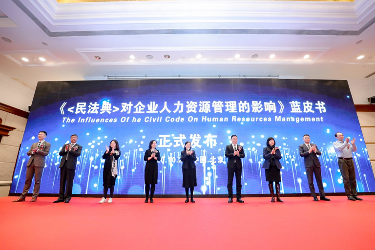 致辞结束后,金锦萍副教授、阎天助理教授作为beat365亚洲版官网劳动法与社会保障法研究所代表,与叶静漪教授及其他出品方代表共同发布了《〈民法典〉对企业人力资源管理的影响》蓝皮书。该蓝皮书共设八章,聚焦法典对人力资源管理的影响,涉及员工入职管理、薪酬岗位管理、特殊员工管理、员工人格保障、企业权益保护、员工离职管理和劳资争议管理七个方面,对于提升企业管理技能、增强企业法制意识具有重要参考价值。