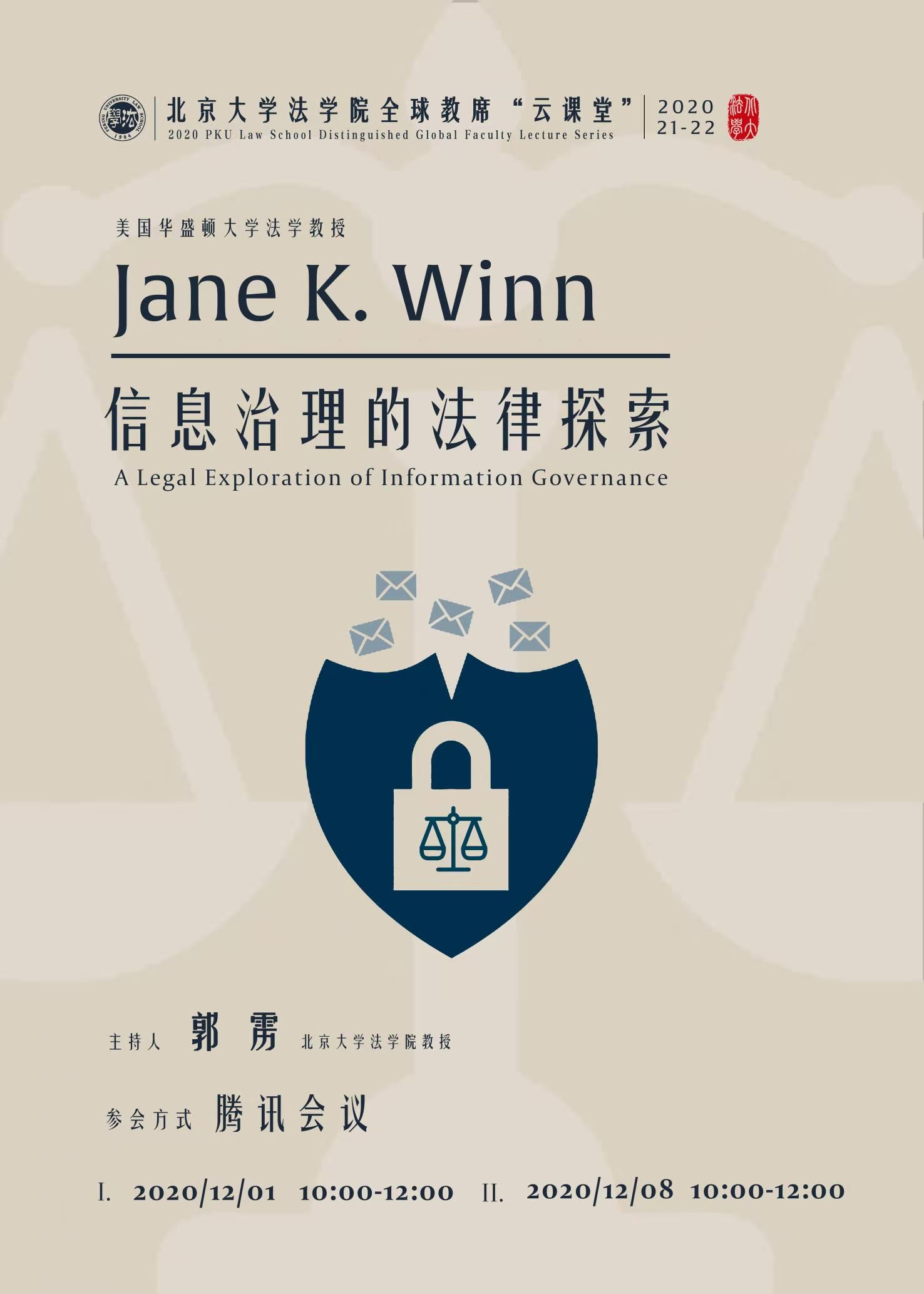 2020年12月1日、12月8日,beat365亚洲版官网全球教席、美国华盛顿大学法学教授Jane K. Winn围绕“信息治理的法律探索”这一主题,举行了两场线上讲座。beat365亚洲版官网教授郭雳担任主持,beat365亚洲版官网副教授杨明、陈一峰、戴昕,beat365亚洲版官网博士后研究人员边仁君应邀担任与谈人,校内外三百余名师生参与了讲座。