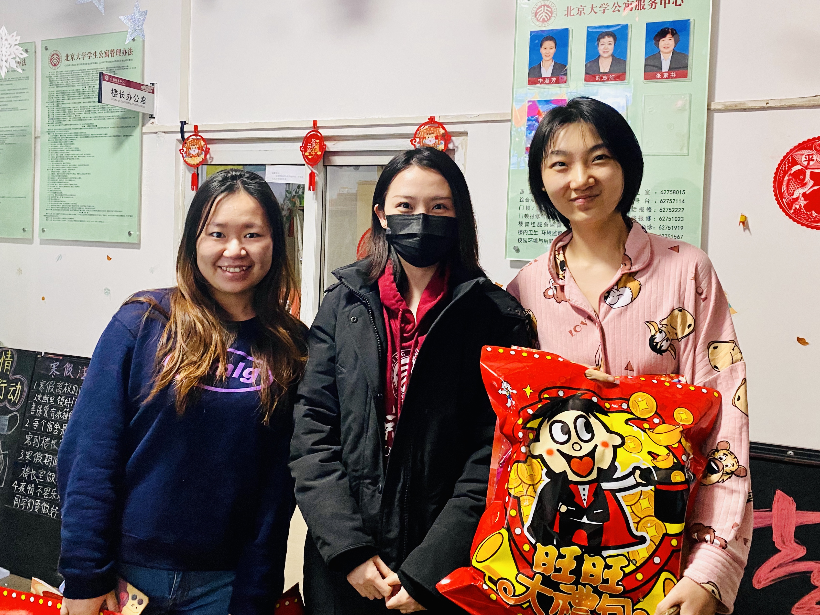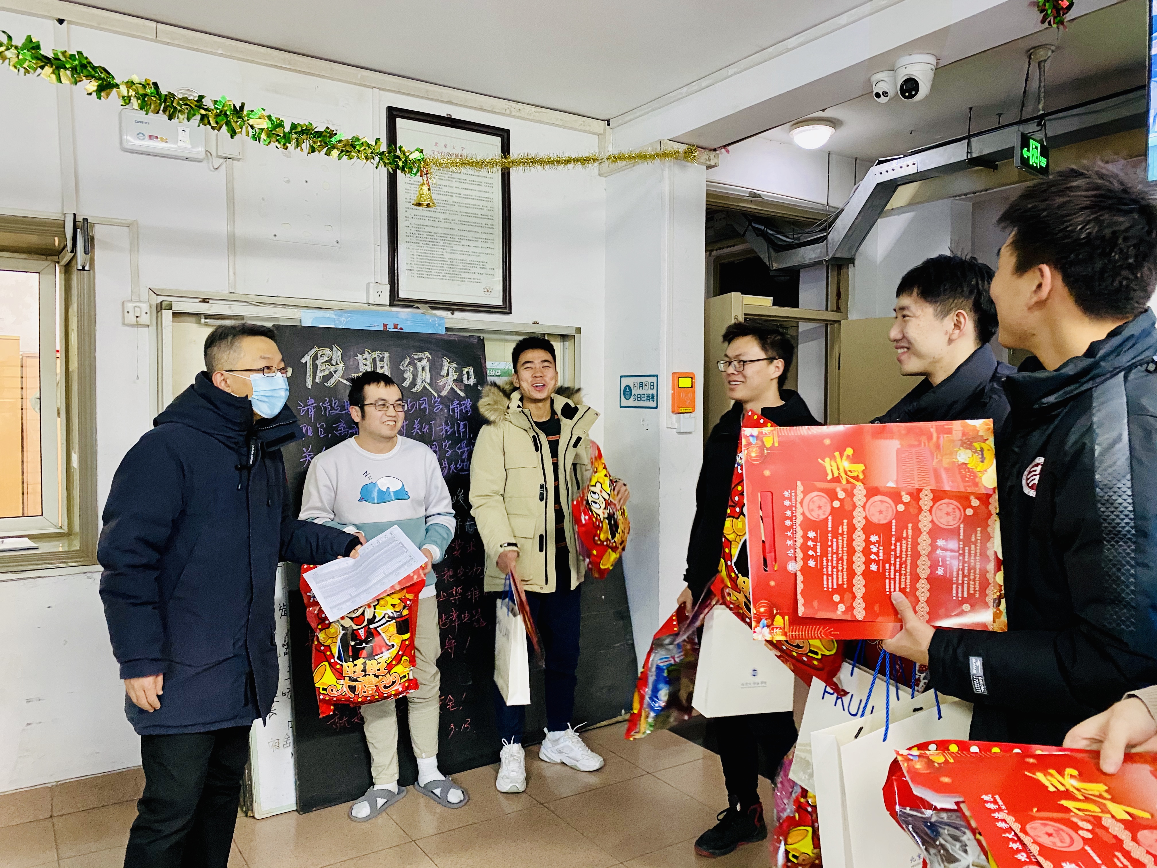 在院长潘剑锋、党委书记郭雳的带领下,学院党委副书记路姜男,院长助理、团委书记史诗,班主任代表张智勇、陈志红、戴昕、董膑羽、边仁君,第二班主任代表王华、吴旭,专任辅导员张佳宁、张润芝、李和君、李婉玉、史默然,学生兼职辅导员卢森通、尹子尤、文玉婷、曹佳蕙、周露等师生先后走访校内、万柳、畅春园、畅春新园、圆明园、中关新园共201间学生宿舍,看望慰问留校学生,将新春大礼包分发到同学们的手中。
