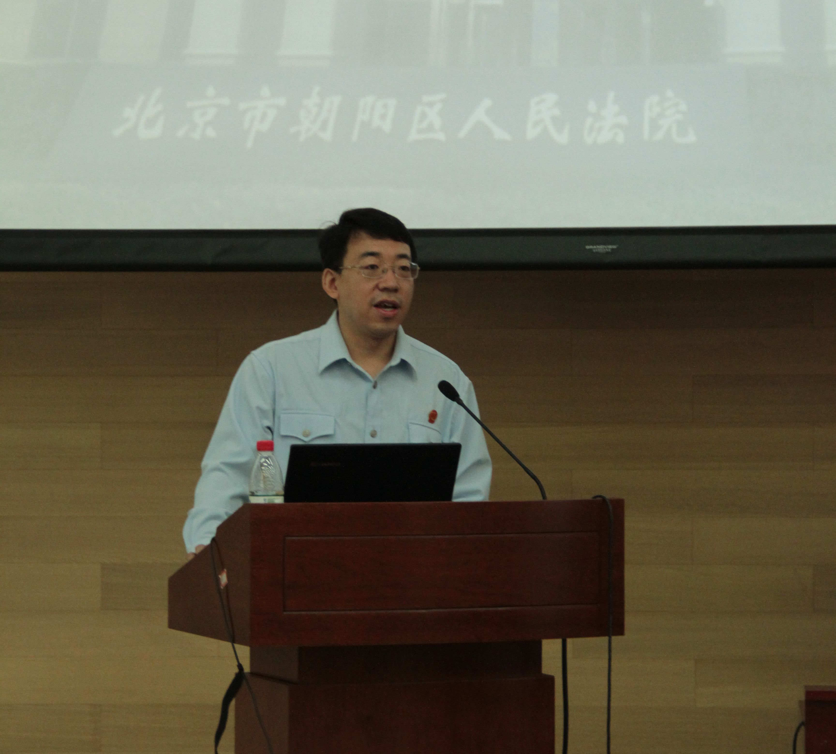 首先,毛力主任对朝阳区人民法院的概况进行了介绍。他从地理位置、派出机构、人员构成、休闲娱乐等不同的角度出发,通过详尽的介绍使与会同学对朝阳区人民法院有了全面直观的了解。他提到,朝阳区人民法院位于朝阳区朝阳公园南路,毗邻朝阳公园,坐拥CBD,具有得天独厚的区位条件。朝阳法院成立至今已有50余年,是全国最大的基层法院之一,有奥运村法庭、南磨房法庭等八个派出法庭。此外,毛主任还给同学们介绍了部分朝阳区人民法院的优秀青年干部,解释了竞争上岗的人才选拔机制和“1+4”青年法官培养模式。