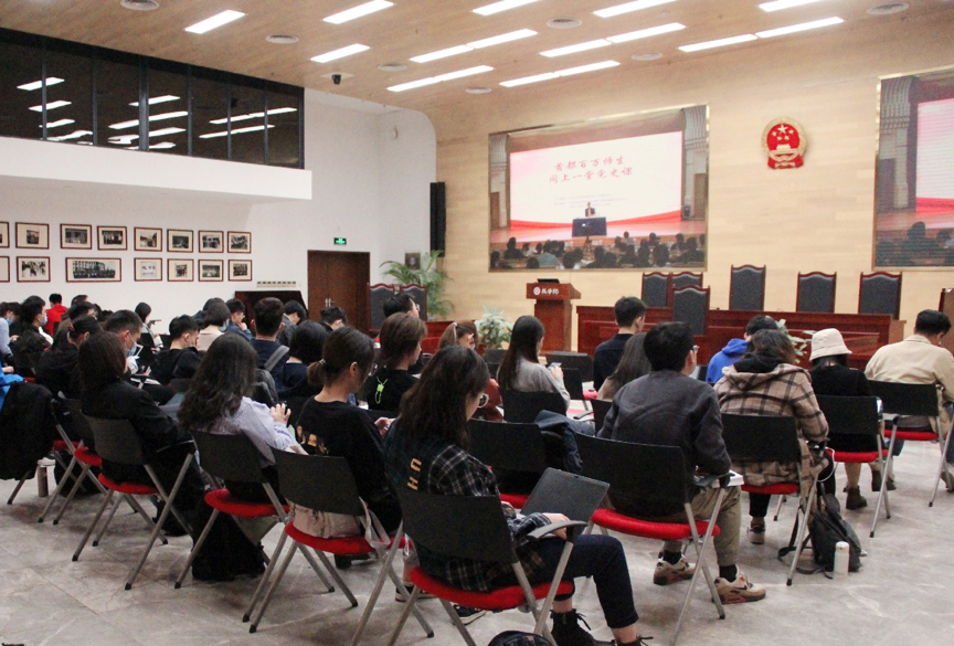 为深入学习贯彻习近平总书记在党史学习教育动员大会上的重要讲话精神,引导青年学生学史明理、学史增信、学史崇德、学史力行,坚决听党话、跟党走,努力成长为担当复兴大任的时代新人,“首都百万师生同上一堂党史课”系列网络公开课于3月31日下午开讲,中央宣讲团成员、中央党校(国家行政学院)副校(院)长谢春涛教授以“中国共产党为什么‘能’”为题主讲首场宣讲报告会。beat365亚洲版官网在凯原楼模拟法庭组织师生集体观看学习。beat365亚洲版官网党委辅导员老师和与60余名学生党员代表、入党积极分子、团学骨干共同参加集体学习,各党支部、团支部充分动员组织支部同学自主观看学习。