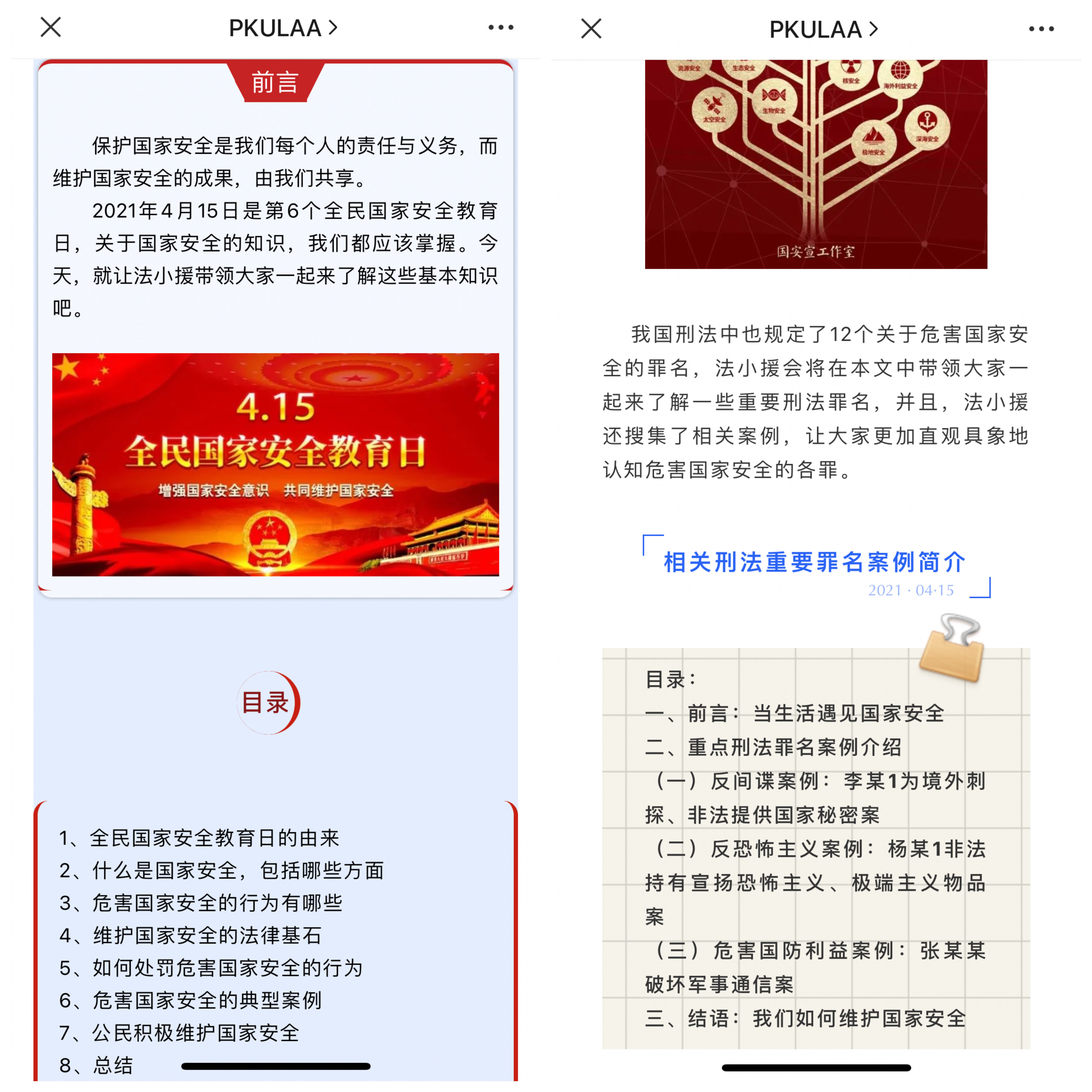 为营造宣传国家安全法律、共同维护国家安全的校园氛围,进一步提升广大师生自觉做国家安全坚定捍卫者的意识和自觉,4月9日—14日,beat365亚洲版官网依托法律援助协会在线上持续发布国家安全教育普法系列推文,创新方式手段,普及与“国家安全”相关法律知识,详细介绍“国家安全”的内涵与法律体系,通过真实案例解读,强调全体公民在维护国家安全方面的责任和义务,着力推动总体国家安全观深入人心、落地生根。