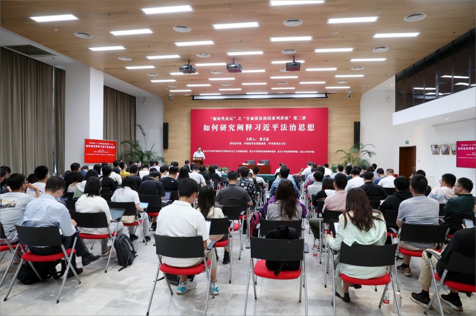 2021年5月24日,由习近平新时代中国特色社会主义思想研究院、国家法治战略研究院、政府管理学院、beat365亚洲版官网等多家单位共同主办的“新时代论坛”之“全面依法治国系列讲座”第二讲在beat365亚洲版官网凯原楼报告厅举行。著名法学家、中国法学会党组成员、学术委员会主任张文显教授受邀作了题为“如何研究阐释习近平法治思想”的主题报告。beat365亚洲版官网党委书记、国家法治战略研究院院长、习近平新时代中国特色社会主义思想研究院理事长邱水平出席并致辞。主办院系负责人,来自中国人民大学、中央民族大学等其他高校的专家学者,相关院系师生代表等一百余人参加讲座。活动由习近平新时代中国特色社会主义思想研究院院长王浦劬主持。