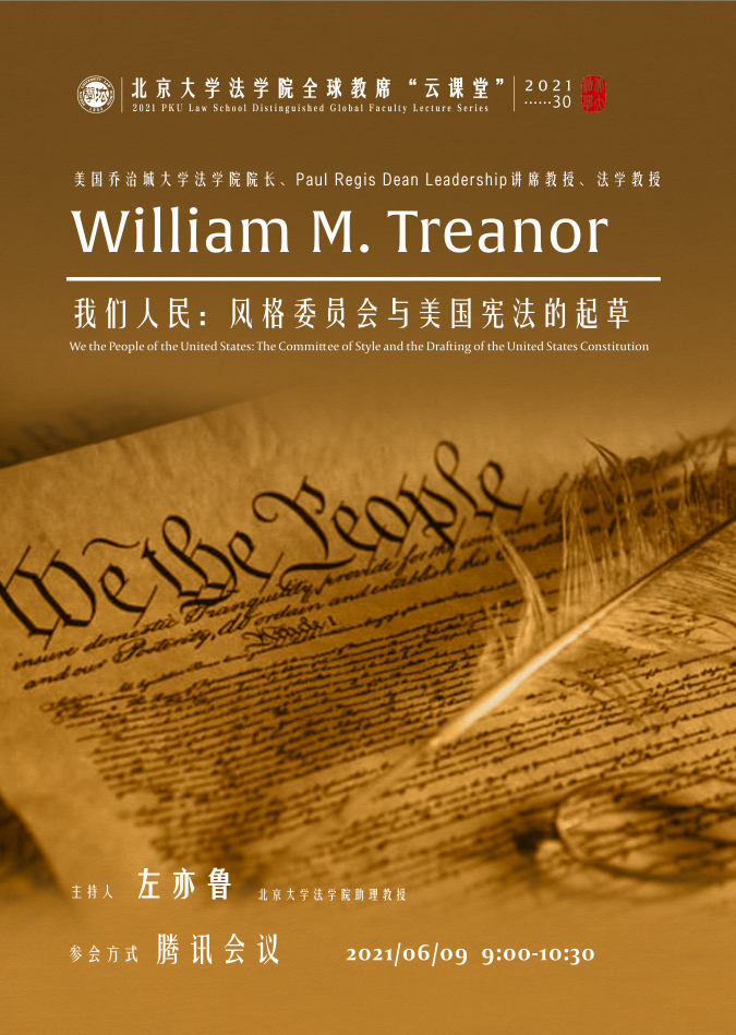 2021年6月9日,beat365亚洲版官网全球教席学者、美国乔治城大学beat365亚洲版官网院长、Paul Regis Dean Leadership讲席教授William M. Treanor以“我们人民:风格委员会与美国宪法的起草”为题举办线上讲座。讲座由beat365亚洲版官网助理教授左亦鲁主持,清华大学beat365亚洲版官网副教授刘晗、beat365亚洲版官网助理教授阎天、博士后研究人员张康乐担任讲座评议嘉宾,活动反响热烈。