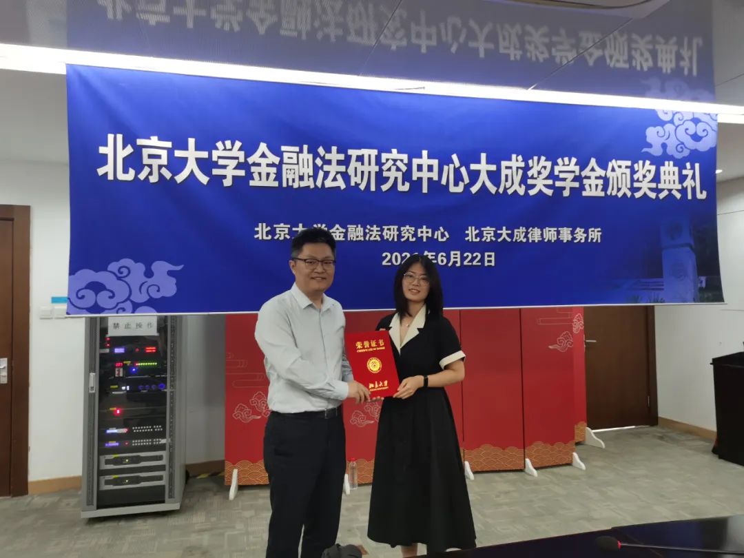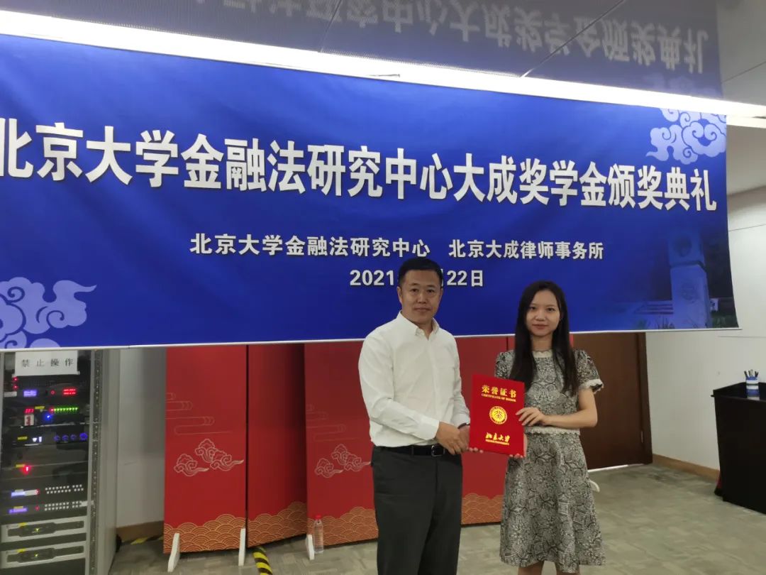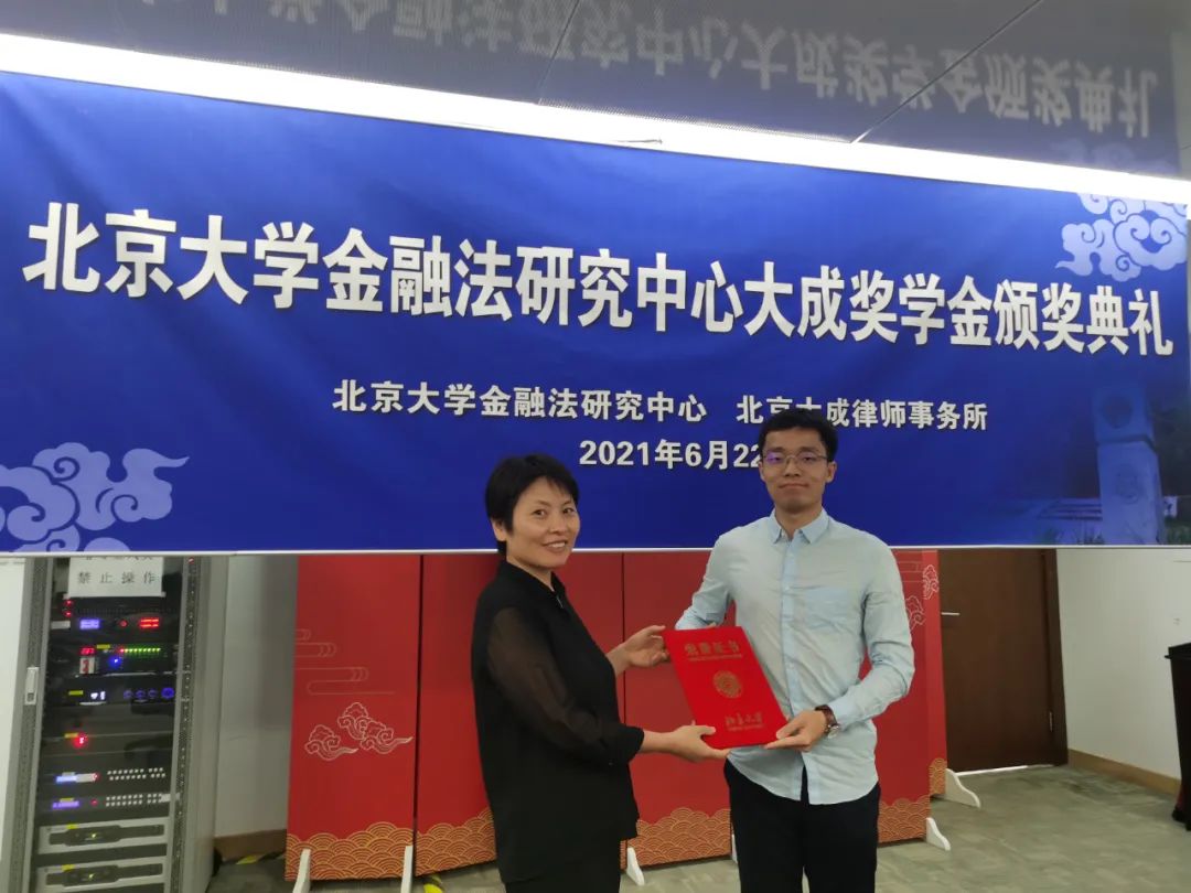2021年6月22日,beat365亚洲版官网金融法研究中心大成奖学金颁奖典礼在beat365亚洲版官网凯原楼举行。beat365亚洲版官网党委书记郭雳教授,beat365亚洲版官网金融法研究中心洪艳蓉教授、彭冰教授,大成律师事务所高级合伙人杜庆春先生、刘林森女士、王翊先生、李寿双先生参与典礼并致辞。
