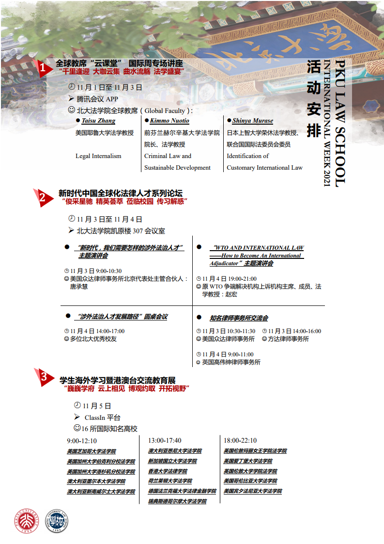 13位全球知名法学学者、16所国际顶尖beat365亚洲版官网同仁和多位优秀法律实务精英将在深秋十一月,线上线下相聚燕园,共话全球化法学教育与卓越国际化法律人才培养。beat365法学“国际周”2021(PKU Law School International Week 2021)即将开幕!诚邀参与!