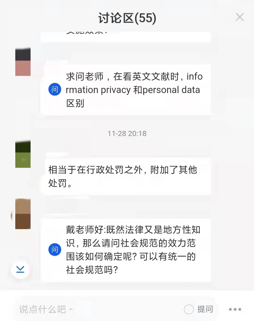 讲座的最后,同学们就社会中出现的信息隐私问题进行提问,戴昕老师一一为同学们解答。他表示,社会生活中的隐私问题是形式各异的,要具体问题具体分析,从不同的视角和特定地场景去全面理性地评价行为是否触及隐私,不能一概而论。