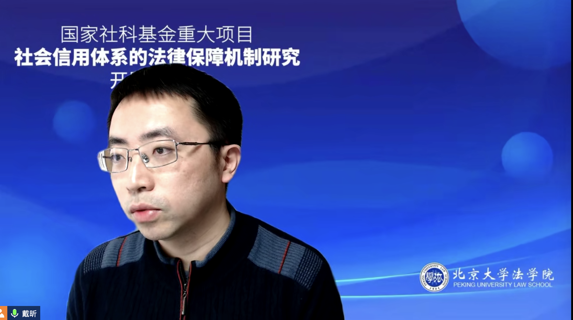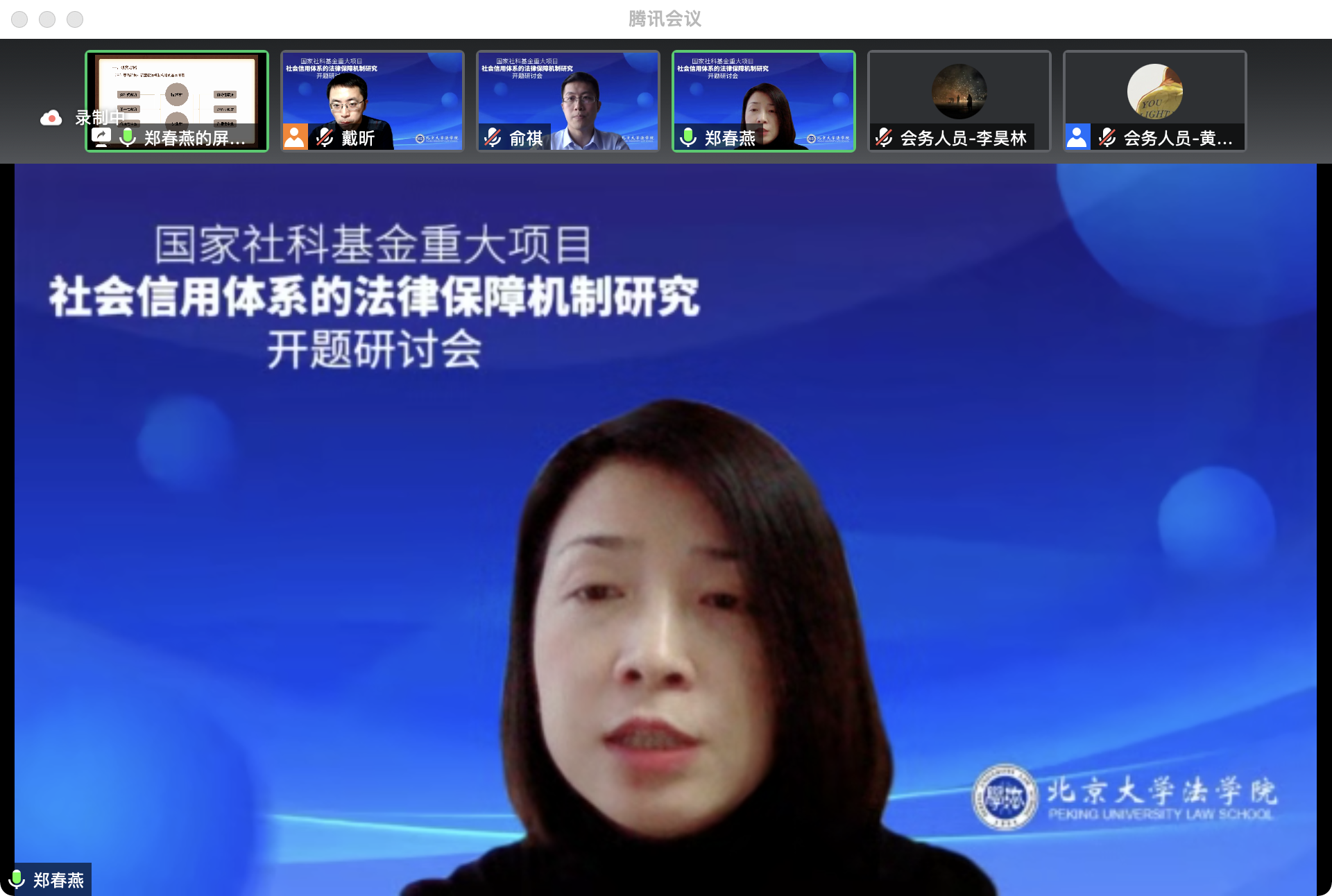 由合作单位承担的项目子课题团队代表国家信息中心周民副主任、国家发改委财金司张春副司长对社会信用体系建设及立法相关工作动态进行了介绍。周民表示,我国社会信用体系建设以信用信息为基础,以信用信息共享、利用为总枢纽,目前已形成大量卓有成效的探索,如公务员信用查询、企业信用信息查询、全国中小企业融资综合信用服务平台(信易贷平台)建设、信用中国网站建设等。周民指出,《国务院办公厅关于进一步完善失信约束制度构建诚信建设长效机制的指导意见(国办发〔2020〕49号)》标志着社会信用体系进入高质量发展的新阶段,期待本课题能够在总结提炼已有经验同时,凝聚学界共识,吸收学界经验,为我国社会信用体系高质量发展提供智力支持。张春副司长指出,社会信用体系建设是具有中国特色的治理创新实践,我国目前社会信用体系建设主要由行政力量主导和推动,发展迅速,但也同时存在不平衡、不充分的情形。张春表示,社会信用立法有其紧迫性,期望本课题能形成支撑立法的丰硕成果,并壮大我国社会信用体系研究队伍。