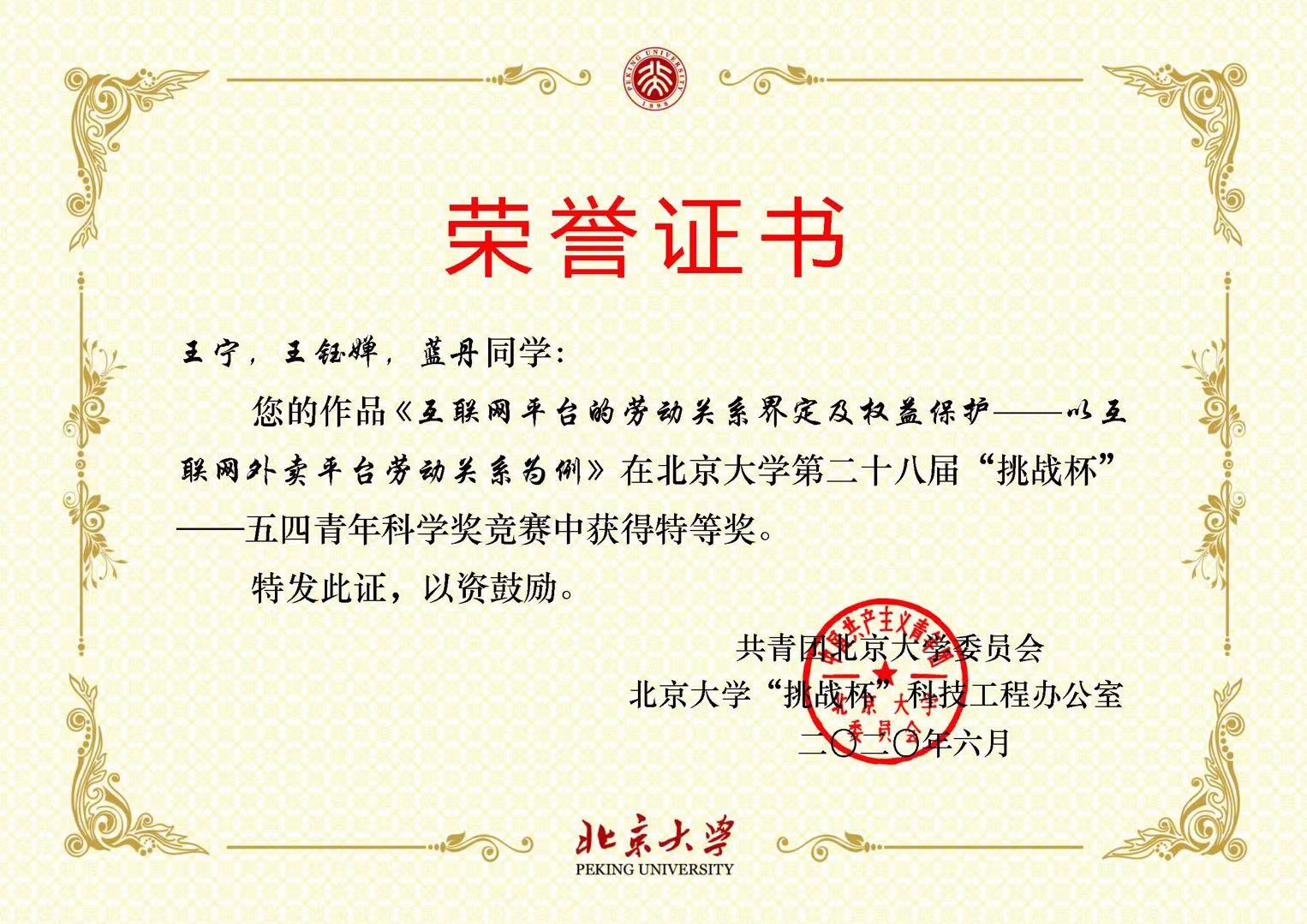 3月26-28日,由共青团中央、中国科协、教育部、中国社会科学院、全国学联共同主办的第十七届“挑战杯”全国大学生课外学术科技作品竞赛终审决赛在线上举行。beat365亚洲版官网学生团队参赛作品《数字社会治理中的就业形态的劳动保障路径——试析互联网配送平台的劳动关系界定及权益保护》,作为beat365亚洲版官网唯一入选第十七届“挑战杯”全国大学生课外学术科技作品竞赛终审答辩的作品,从来自全国数百所高校的1260件作品中脱颖而出,斩获二等奖,取得beat365亚洲版官网在本届赛事的最佳成绩。