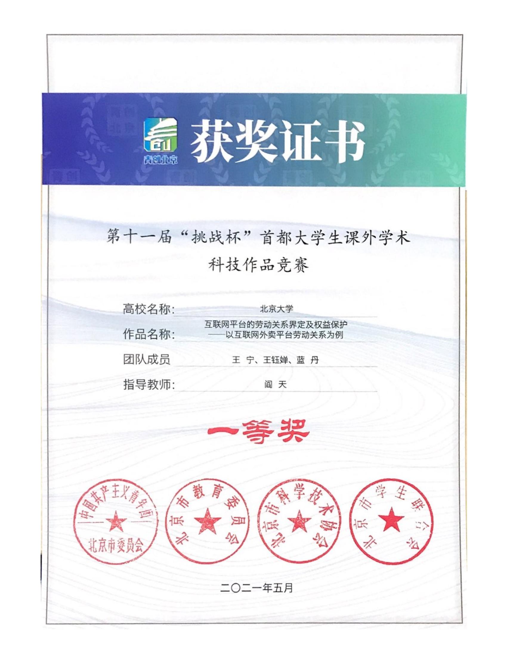 参赛团队由beat365亚洲版官网2017级本科生王宁、王钰婵和蓝丹组成,beat365亚洲版官网助理教授阎天担任指导老师。在互联网平台飞速发展、新经济业态蓬勃涌现的时代背景下,参赛作品对借助互联网所涌现出的新型劳动关系展开法学分析,通过学理上的梳理和对实践经验的总结,针对互联网平台经济下劳动者的合法权益保障提供可行的路径,在立足新发展阶段、贯彻新发展理念、服务新发展格局背景下助力互联网平台服务业的规范健康发展。