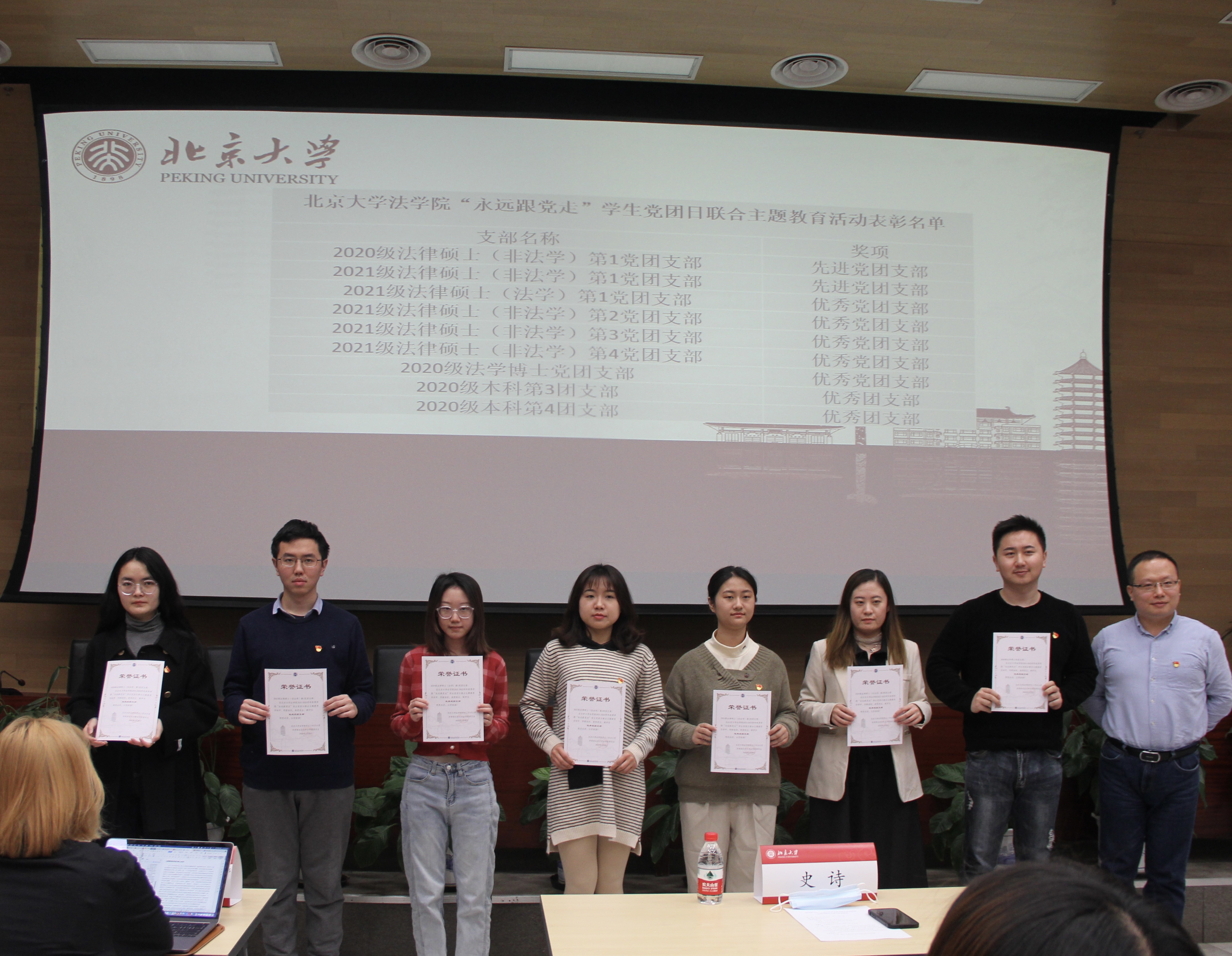 史诗老师为2021-2022学年秋季学期beat365亚洲版官网“永远跟党走”学生党团日联合主题教育活动获奖支部颁奖。2021级法律硕士(非法学)第一党支部邓凯夫作为获奖支部代表分享工作经验。他从党员管理、组织生活、制度落实等方面展开细致分享,为各支部开展好春季学期党团日联合主题教育活动提供宝贵经验。经验分享结束后,19个非新生年级党支部依序对2021年度党支部工作进行现场述职并分享交流经验。
