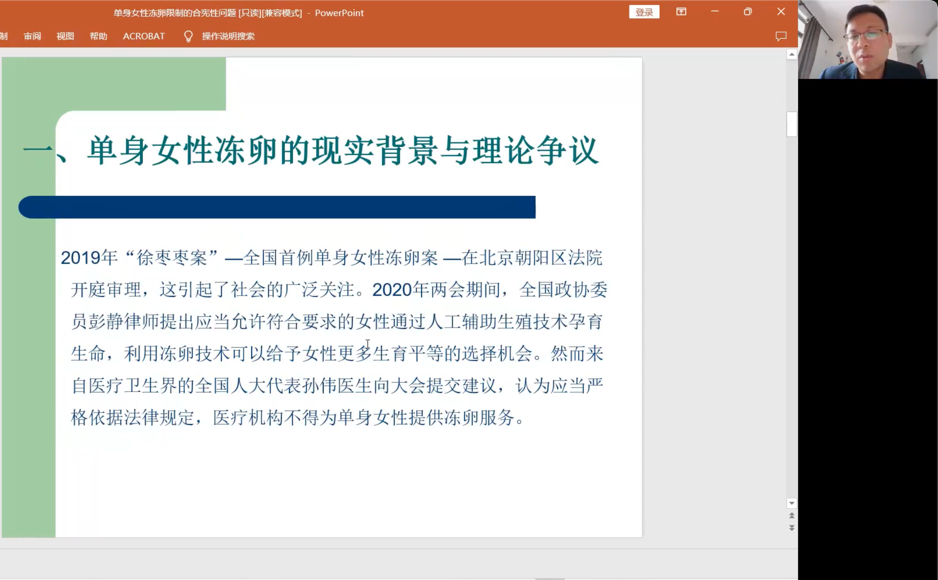 随后,课题组专家分别就自己的工作进展情况和已经取得的科研成果进行报告,研究领域涉及ART技术、伦理、宪法行政法、民法和刑法等多个维度,包括ART技术的临床发展、ART 应用的伦理问题、生育权利作为宪法权利的证成与限制、ART主体之间的民事权利和义务关系,以及不符合规定的ART应用的可罚性等问题。会议还听取了孙靖洲博士、吴柯苇博士、孔杨博士、张钧凯博士生、张靖辰博士生、韩双双和朱星润硕士生等课题研究的工作论文汇报。