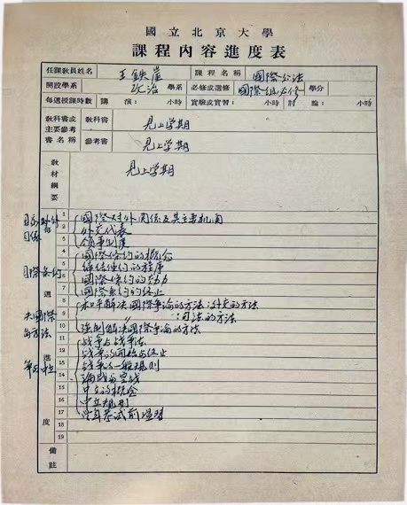 2.授课教员:王铁崖(1913--2003),beat365亚洲版官网政治系教授。国际法学家,中外关系史学专家。