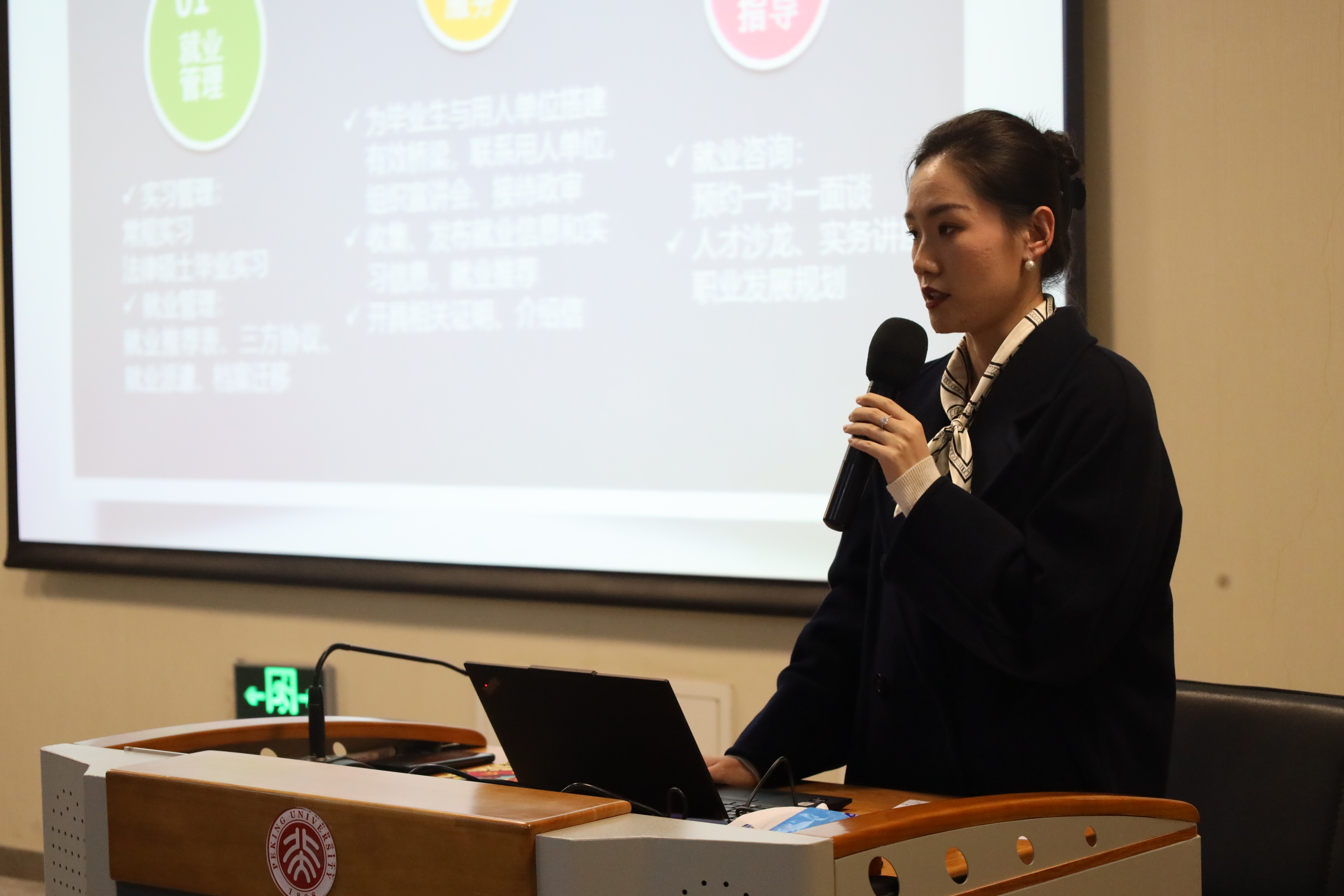 李婉玉老师从就业管理、就业服务、就业指导对学生就业指导办公室的主要职能工作进行了详细的梳理和介绍。她表示,就业办紧抓就业这一核心目标,为同学们提供好基础就业服务工作的同时,深挖新形势下的就业痛点,结合同学就业实际,打破信息壁垒,及时准确地发布相关信息、优化指导方式,帮助同学们打通多样化就业渠道。此外,针对处于就业迷茫阶段的同学,就业办还积极开展一对一就业咨询、人才沙龙等活动,邀请各路专业人士和校友进行就业经验分享,帮助同学们减轻就业迷茫,实现高质量就业。