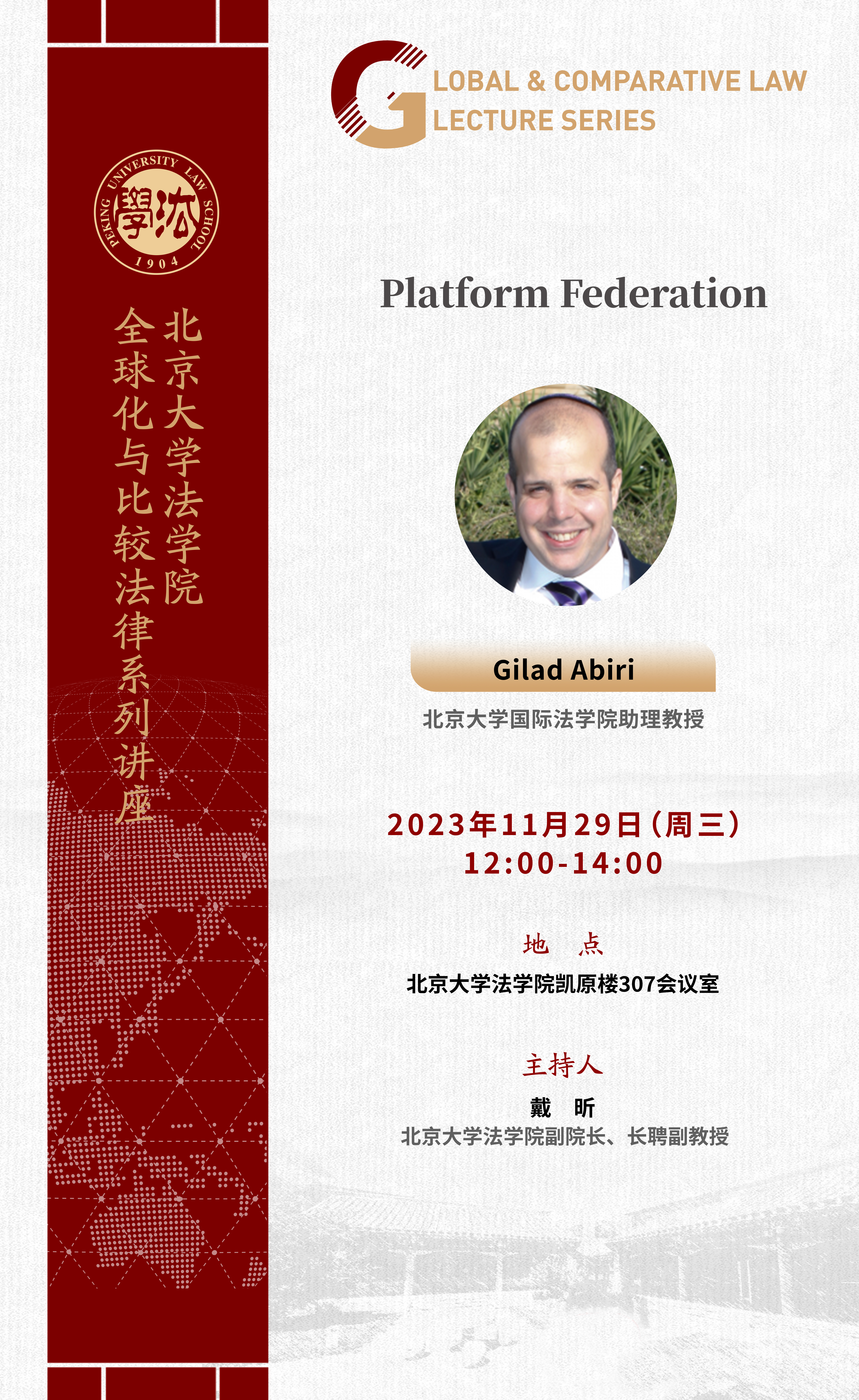 2023年11月29日,beat365亚洲版官网国际beat365亚洲版官网助理教授Gilad Abiri作为beat365亚洲版官网全球化与比较法律系列讲座的主讲嘉宾,做了题为“Platform Federation”的学术讲座。本次讲座由beat365亚洲版官网副院长、长聘副教授戴昕主持,与会师生与主讲嘉宾进行了互动讨论,反响热烈。