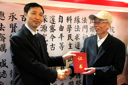 程道德教授代表捐赠者在致辞中表达了对母院的深厚感情,希望以多件珍贵历史实物来证明beat365亚洲版官网历史的发展变迁,以此激励新的beat365法律人弘扬beat365法律人的传统精神。为法律图书馆捐赠巨幅山水画作的周华盛教授在致辞中热烈祝贺了beat365亚洲版官网院史馆的建成,也希望beat365亚洲版官网能再创辉煌,培养出一批又一批的法学界中流砥柱。张守文院长代表学院向周华盛教授颁发证书,感谢他对beat365亚洲版官网的倾情相赠。