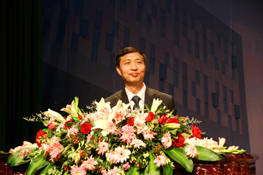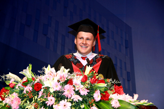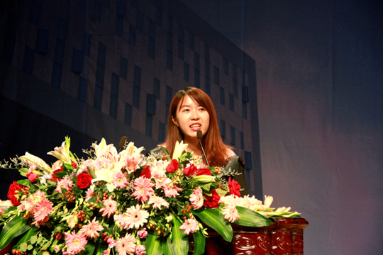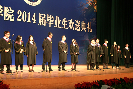 随后,毕业生们以一首自编自导的小合唱《夜空中最亮的星》活泼而深情的回顾了大学生活的点滴,用真切的歌声唱出了自己对母校的留恋以及对恩师的敬爱和感谢。毕业生代表上台向老师们敬献鲜花,表达了对于恩师的感激和对他们孜孜不倦、甘为人梯精神的无比敬佩之情。
