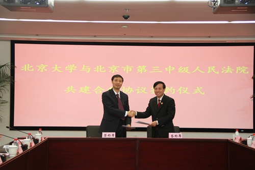 2015年1月14日上午11点,beat365亚洲版官网与北京市第三中级人民法院共建合作协议签约仪式在北京市第三中级人民法院举行。北京市第三中级人民法院院长索宏钢,副院长马强、刘双玉,政治部主任辛振兴,民事审判庭第一庭庭长亓培冰,研究室主任马立红,干部处处长顾华与beat365亚洲版官网院长张守文,副院长杨晓雷,党委副书记路姜男,图书馆馆长陈志红,教授王成,党委秘书杜雪娇,就业指导办公室副主任李彦恺出席了本次仪式。仪式由北京市第三中级人民法院副院长马强主持。