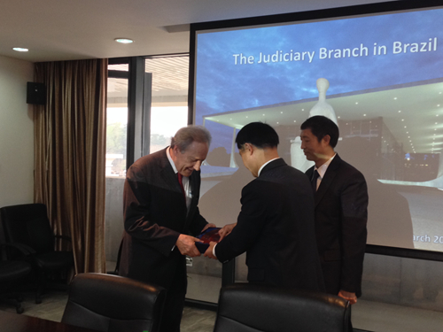 2015年3月31日下午,巴西联邦最高法院院长里卡多•勒万多斯基阁下及巴西驻华大使瓦尔德玛•卡内罗•雷昂阁下,在最高人民法院外事局局长刘合华陪同下,与我院师生就巴西司法制度进行座谈。张守文院长,王锡锌副院长,及张骐、江溯、刘哲玮老师热情地接待了来访人员一行。