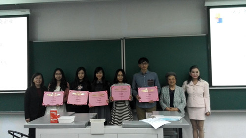 万以娴律师(右一)、贾俊玲教授(右二)、叶静漪教授(左一)和一等奖获得者