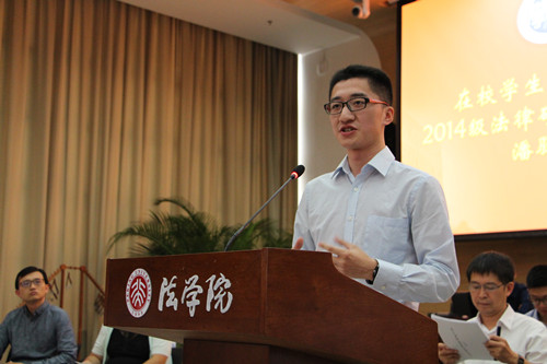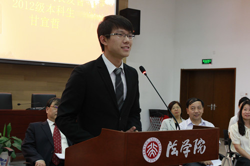 随后,2012级本科生甘宜哲代表高年级同学发言。他鼓励各位同学在将来的学习中不要放弃自己的信念与坚持,做一名辛勤的耕耘者,成为一名合格的法律人,为社会贡献自己的一份力量。