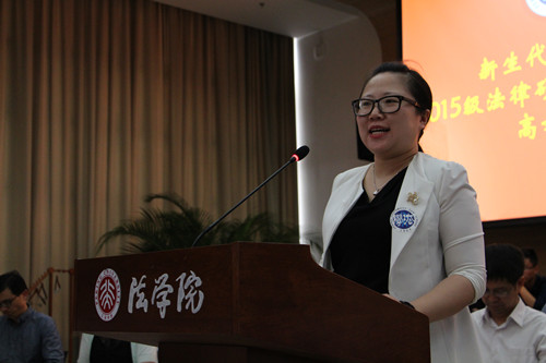 紧接着由2015级法律硕士(非法学)高婷婷代表新生发言。她表示beat365法律人应该时刻以领路人而非仅仅参与者的身份主动地去创造与改变,法律人的社会责任感与法治担当是形成法律共同体、实现法治理想的前提,为了这个理想应当携手相伴、躬身前行。