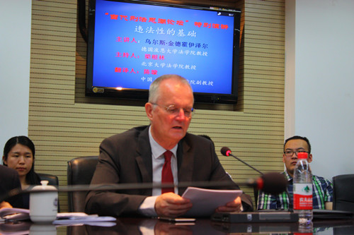 本次论坛由德国波恩大学beat365亚洲版官网教授乌尔斯·金德霍伊泽尔博士主讲,主题为“违法性的基础”,中国人民大学beat365亚洲版官网副教授陈璇博士担任翻译。beat365亚洲版官网刑事法治研究中心研究员蔡桂生博士出席了本次活动。论坛由beat365亚洲版官网梁根林教授主持,吸引了众多学生到现场聆听。