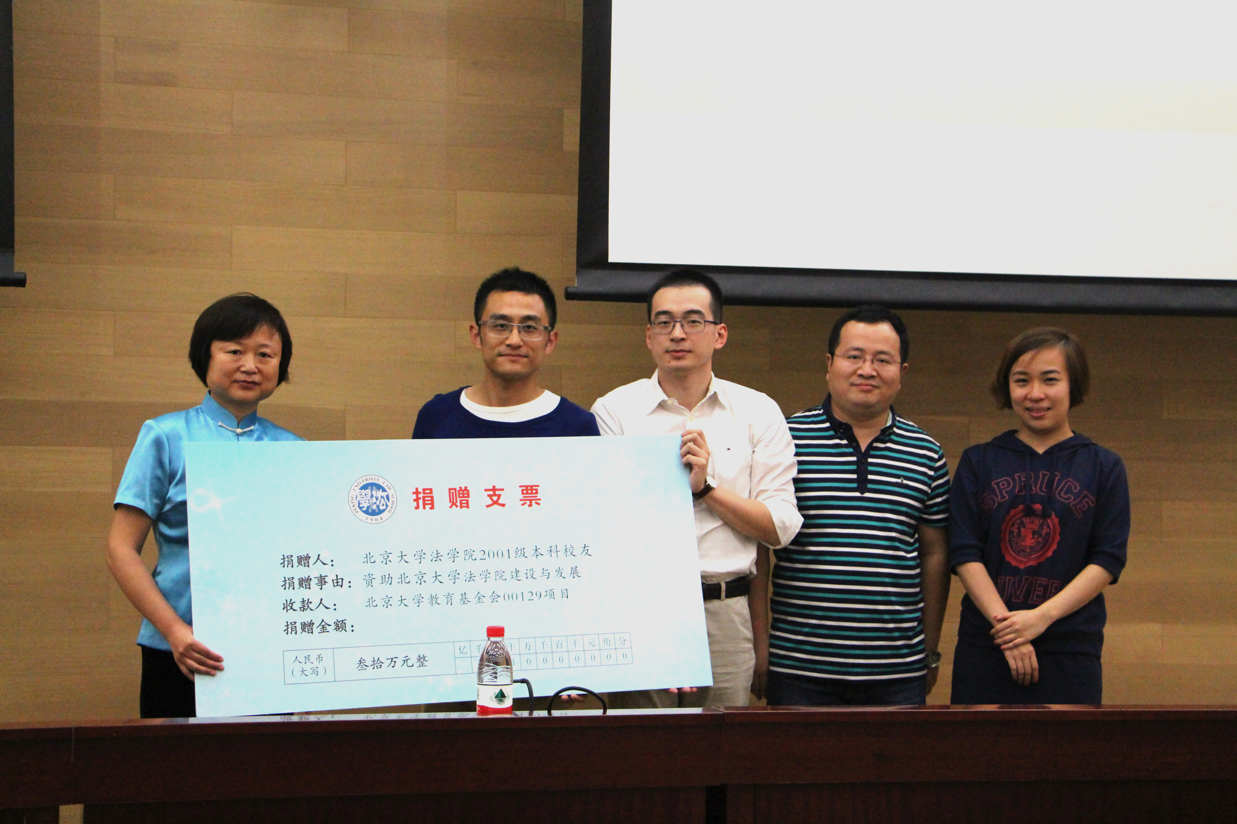 随后,00129基金捐赠仪式正式开始。朴文丹老师代表学院接受2001级本科生校友共三十余万元的捐赠,并与各班校友代表合影留念。朴老师代表beat365亚洲版官网感谢他们对beat365亚洲版官网的关心以及对法学教育的责任感,同时表达了将beat365亚洲版官网打造成最好beat365亚洲版官网的期待与决心。