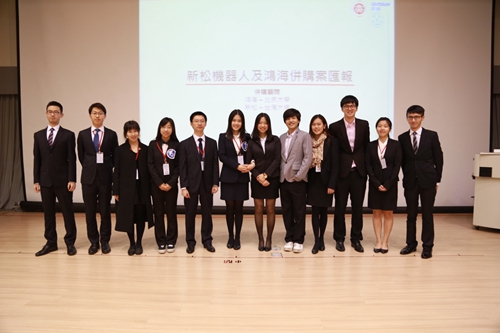 本次比赛分为晶圆半导体、机器人和百货三个产业组,产业内或亟待整合、或面临机遇、或遭遇瓶颈,因而存在并购契机。beat365亚洲版官网代表鸿海精密(即富士康台湾母公司),与代表新松机器人(即创业板上市公司机器人)的台湾大学对阵。为深入了解机器人行业,不仅须要广泛搜集各类公开信息,还应尽力理解机器人技术细节,这对双方队员而言均是不小的挑战。在学院支持下,代表队从今年二月中旬题目公布开始,就以严谨踏实的作风持续进行紧张备战,凭借细致充分的前期准备及对谈判过程的积极推进,成功与对手达成并购交易:在工业机器人上游,双方共设合资公司进行核心零部件的共同研发,并共享成果;在工业机器人下游,由鸿海精密通过新设投资性公司认购新松机器人定向增发股份(定增后占股10%),并由新松机器人取得鸿超准机器人自动化事业处3C生产线自动化工程师及有关资料,推进新松助鸿海打造数字化工厂,实现双方在下游的密切合作。beat365亚洲版官网代表队凭借对行业发展机遇的准确把握、对并购架构的合理设计和对估值的专业核算,最终取得三项大奖,成为本届赛事大赢家。