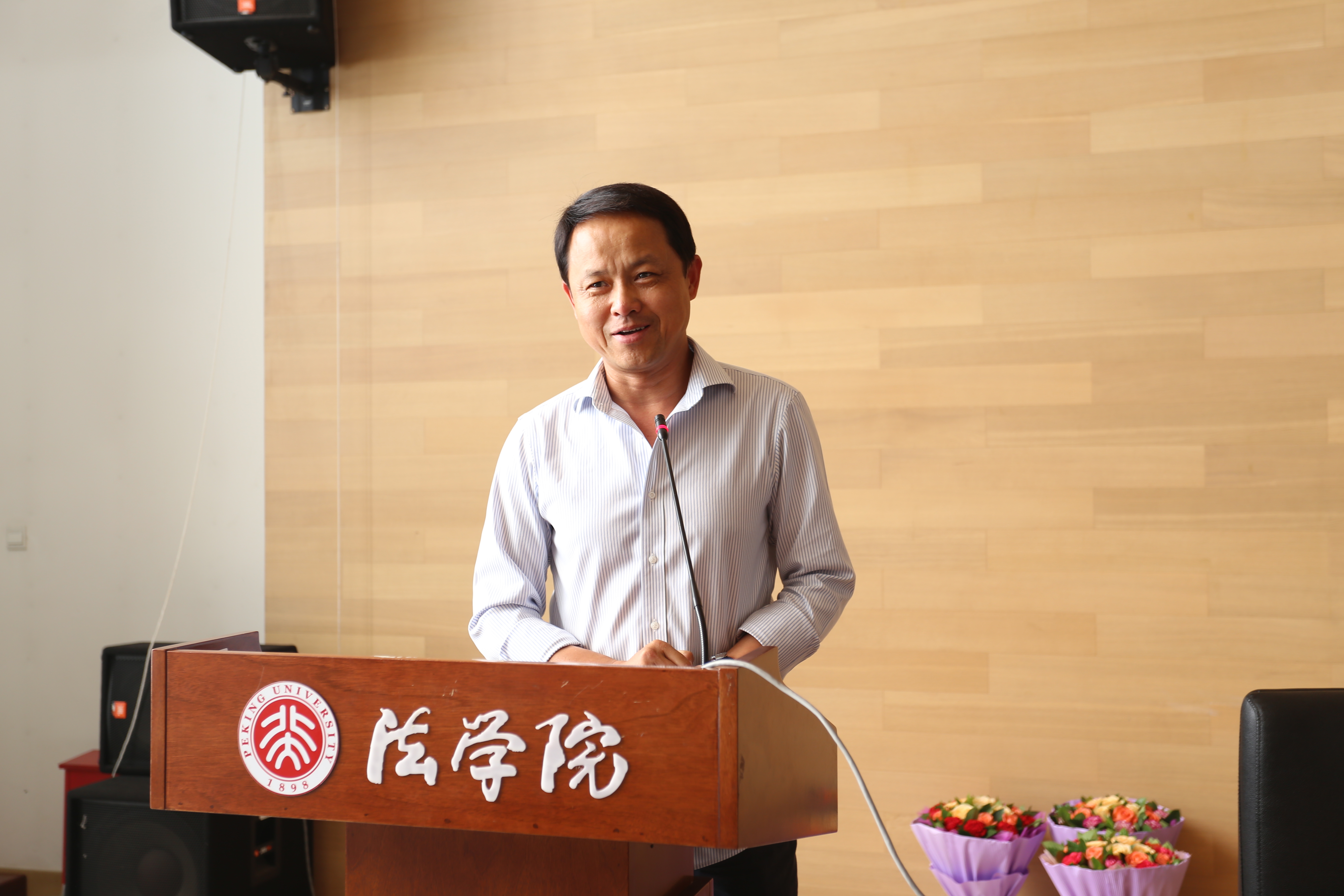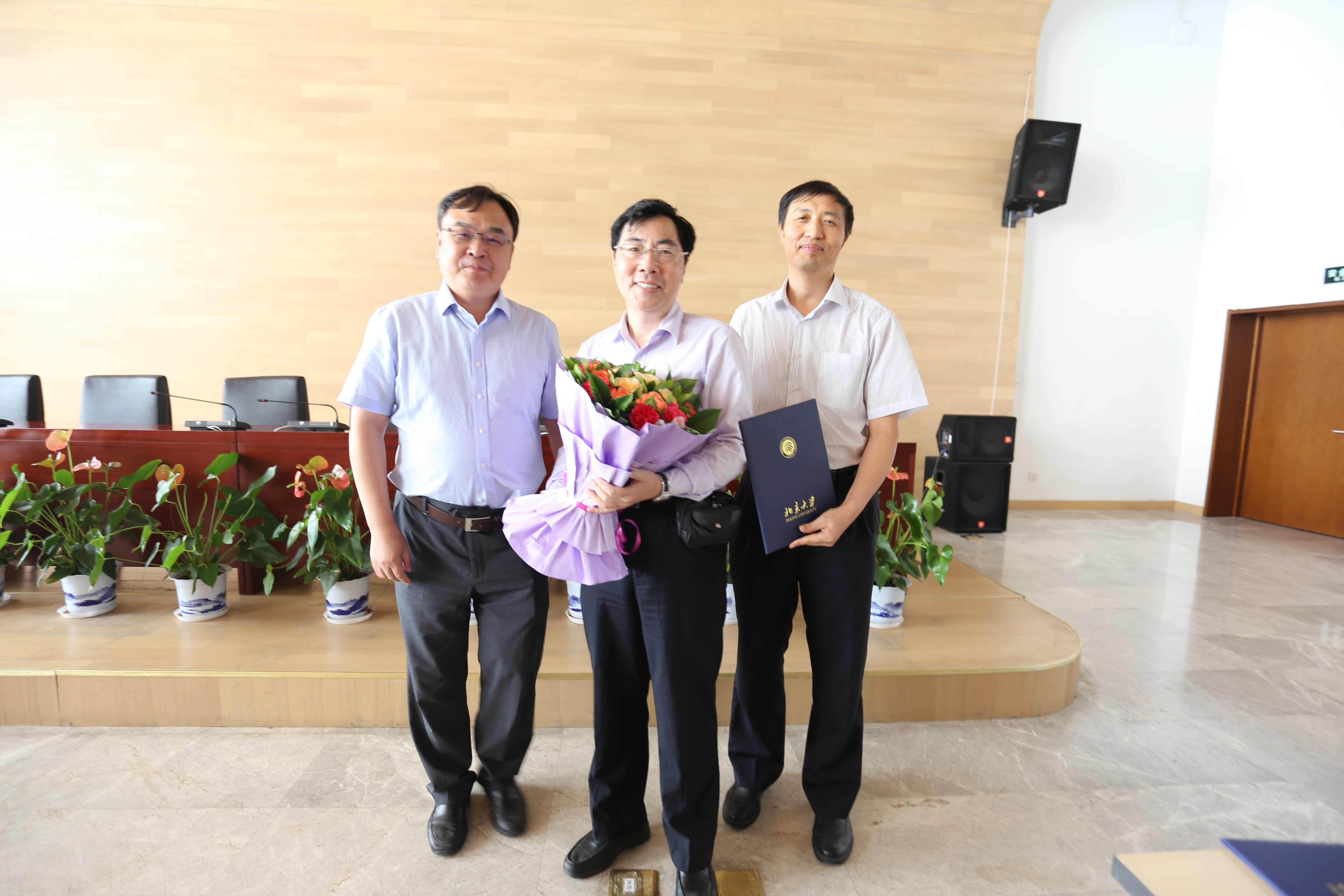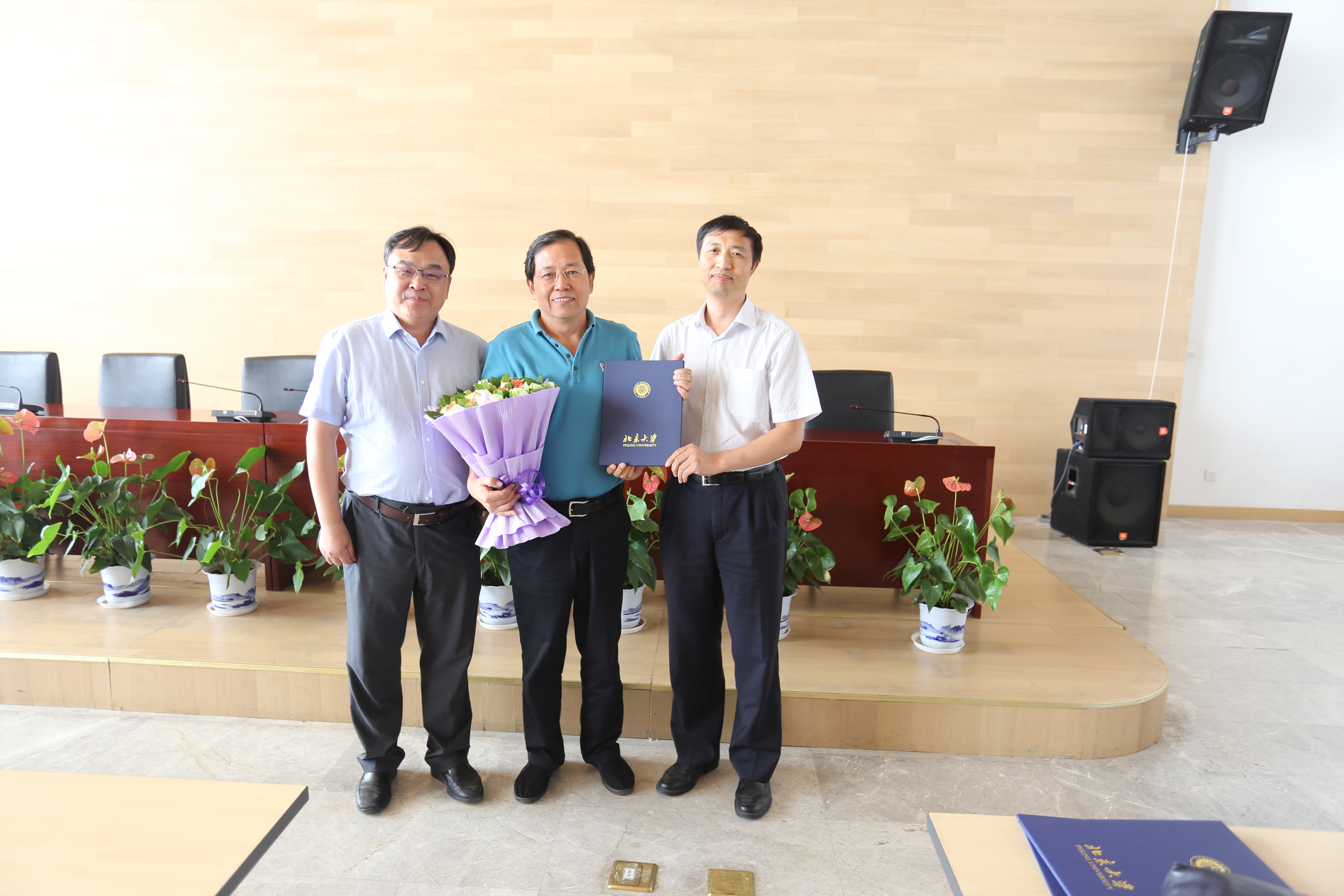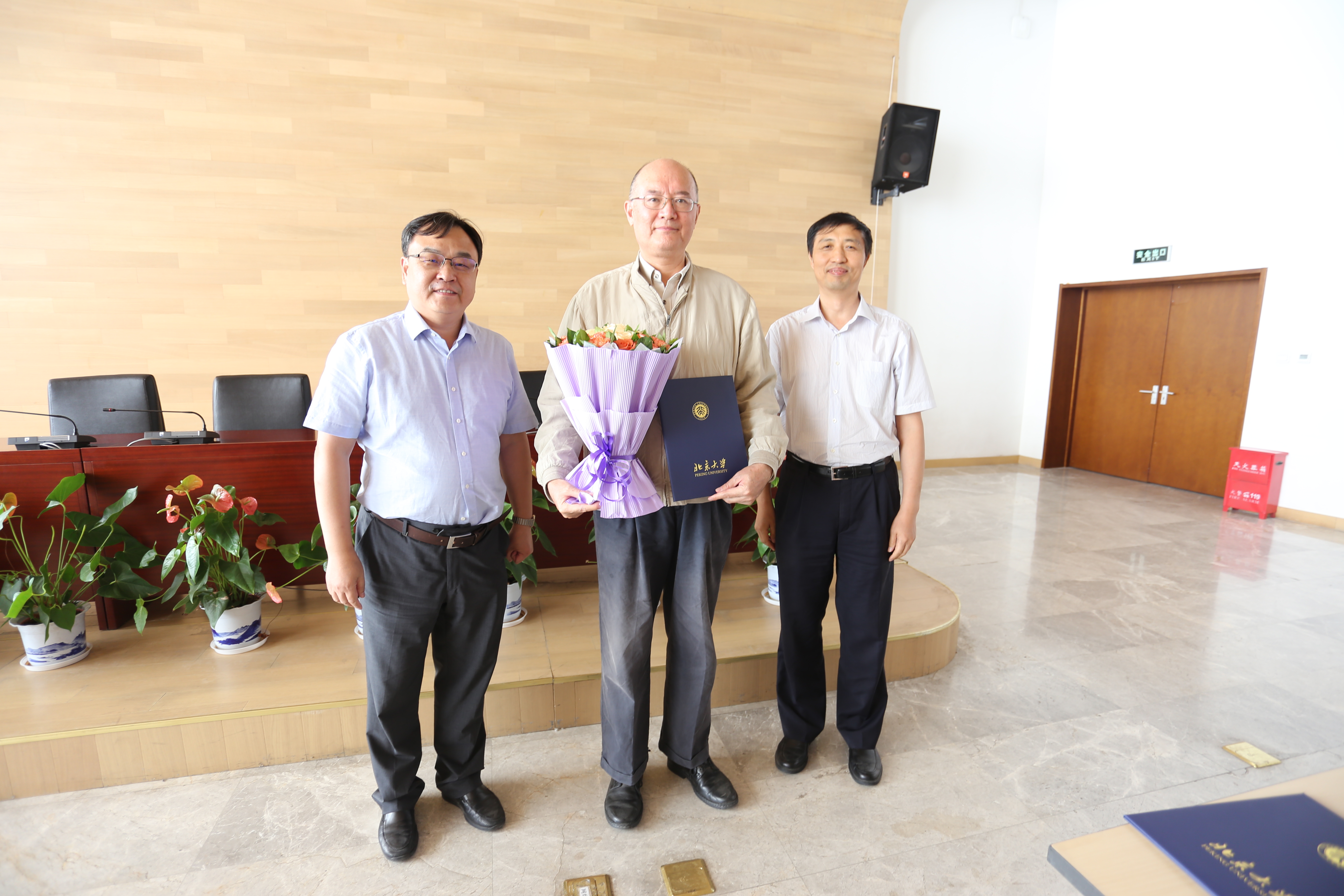 首先,潘剑锋书记主持送别退休教师环节,三名退休教师乔聪启、姜明安、王世洲依次发言,讲述了多年来从教的人生经历与感人故事,表达了对学院深厚浓重的感情。随后,张守文教授、潘剑锋教授为三位退休教师颁发证书和鲜花,并合影留念。