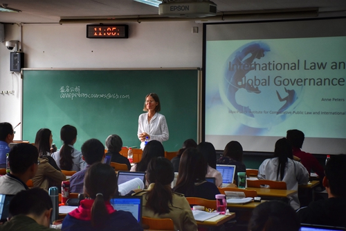 10月19日上午,彼得斯教授主持的“国际法与全球治理”系列课程正式于beat365亚洲版官网第三教学楼开讲。本次课程的主题为“国际法的角色:新议程与新挑战”。彼得斯教授以联合国《2030年可持续发展议程》、2015年《巴黎协定》、近期国际货币基金组织改革、《中俄关于促进国际法的声明》等为例,重申国际法面临着重大结构性变革,国际法学研究也面临着一个新的阶段。彼得斯教授认为,塑造国际秩序的三个主要因素:法律(国际法)、军事力量和经济力量都在发生变化。具体而言,国际社会的力量对比已经发生变化,新兴国家开始登上历史舞台,国际社会呈现出多元性;国家之间的交流和彼此依赖不断增强;人员、资金的流动以及技术的发展使得任何一个国家都无法割裂的独立生存。国际社会的力量变迁,尤其是新力量的崛起开始塑造新的国际秩序,由此带来了国际法的一系列新变化,也促使各国学者对国际法进行新的反思和批判。彼得斯教授对国际法在世界秩序中角色和功能进行了辨析,对国际法无用论甚至国际法共谋论的观点进行了批判。彼得斯教授认为,国际法应当被理解为是一种赋权话语,在国际社会中对贫困和受到公正对待的人赋予发声和主张的权利,为在国际层面追求正义和公平提供了平台,这也是国际法学研究所应当追求和努力的方向。