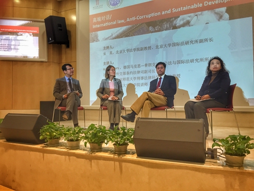 10月24日下午,由beat365亚洲版官网国际合作部、beat365亚洲版官网以及beat365亚洲版官网国际法研究所联合主办的“国际法视角下的反腐败与可持续发展”对话讲座在beat365亚洲版官网二体报告厅成功举办。此次中外教授对话由beat365亚洲版官网副教授、国际法研究所副所长宋英老师主持,由德国马克斯—普朗克比较公法与国际法研究所所长,巴塞尔大学客座教授,海德堡大学荣誉教授安妮·彼得斯教授、外交部条约法律司副司长孙昂、北京师范大学刑事法律科学研究所王秀梅教授以及beat365亚洲版官网陈一峰老师担任主讲人。安妮•彼得斯教授以“贪腐构成对国际人权的侵犯”为主题,从国际人权法的视角对腐败现象进行了解读。彼得斯教授主张,将腐败行为认定为对国际人权的侵犯,这种重新审视和概念化具有一定的合理性。将贪污腐败行为纳入对侵犯国际人权行为,在规范性方面具有积极意义,并可以运用现有10多个现有国际人权文书和机构来对打击腐败提供新的可能性。随后,孙昂副司长以“反腐败与海外资产追回之中国经验”为题着重介绍了中国在进行反腐败活动和海外资产追回的实践经验。王秀梅教授以“腐败、反腐败与经济发展”为题分析了腐败与反腐败对经济发展的影响。陈一峰老师则以“世界银行的反腐败议程及制裁机制”为题做了报告,围绕世界银行在反腐败方面所承担的角色、结构和运作方式进行了阐述。在点评互动阶段,在座师生争相提问,与主讲人展开了热烈讨论。讲座持续了两个多小时,最终在主讲人细致耐心的解答中落下帷幕。
