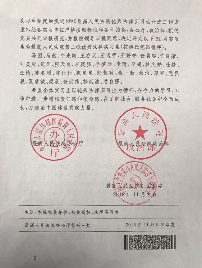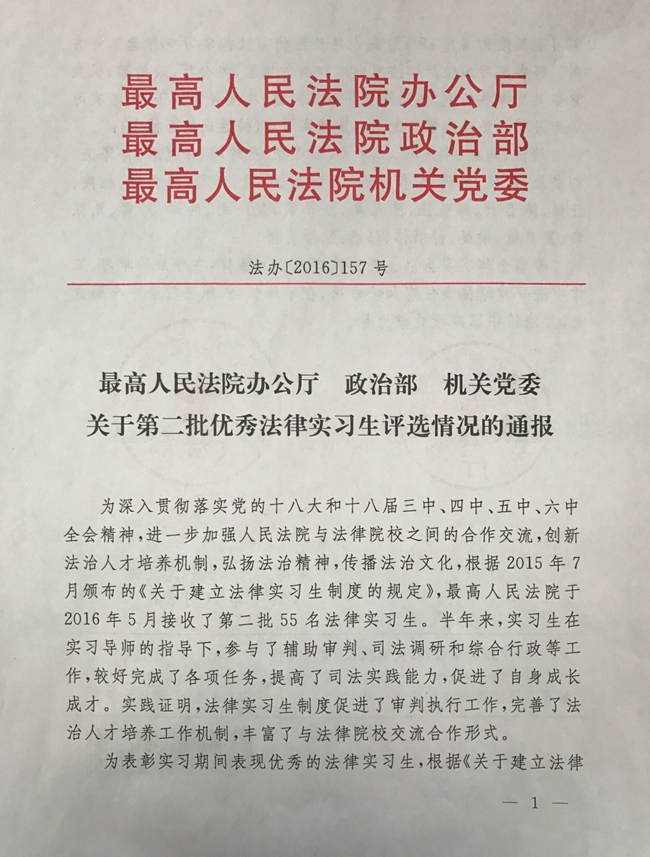 近日,我院收到最高人民法院办公厅发来《最高人民法院办公厅、政治部、机关党委关于第二批优秀法律实习生评选情况的通报》,通报包括我院2015级硕士研究生张天白在内的31位实习生被评定为最高人民法院第二批优秀法律实习生并受到表彰。