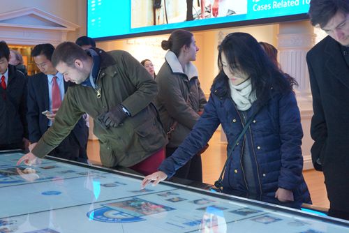 在博物馆工作人员的引导下,同学们首先来到了“全面依法治国,走向伟大复兴”展厅。大家饶有兴致地观看了介绍我国法院建设和审判工作的短片;在互动设施前,同学们通过点击触摸屏,主动浏览各地法院判决的大案要案情况;看到展出的薄熙来、周永康案判决书及庭审中所使用的物品,部分学生还向讲解员仔细询问了两案的案情事实和审判情况。