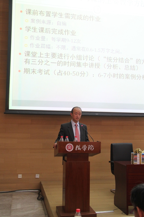 之后,葛云松老师借助对一个具体案例的分析,展示了他在民法案例研习课程中推行的种种教学尝试。首先,葛云松老师指出,beat365亚洲版官网教育的教学目标是向学生传授知识和技能,而所谓技能,又包括了实务技能和智能技能两方面。相比于实务工作者,由于时间分配和精力投入的不同,beat365亚洲版官网教师的比较优势恰恰在于传授更加体系化、抽象的法律知识和解释法律的技能,这同时也是一个教学与学术研究相互促进的教学相长过程。为了充分发挥beat365亚洲版官网教育的比较优势,民法案例研习课程中涉及的案例,其事实部分都是给定的,因为发现事实并非法学教师的比较优势。相反,民法案例研习课程的主要目标,在于训练学生解释、适用法律的能力,通过适用法律来发现解释中的各种困难,从而学习如何运用各种资料和法律解释方法解决问题。在明确了课程目标的基础上,葛云松老师详细介绍了民法案例研习课的课程结构。教师在课前将需要完成的作业布置给学生,作业的内容即为案例分析,案例均由教师自行编写,且案例的事实需要相对简化,将争议点埋藏在看似简单明了的案例事实中。学生需要在课前撰写书面的案例分析报告,作业量为每学期9-12次,作业篇幅不限,通常在6000到15000字之间。课堂采取“统分结合”的授课模式,前三分之二的时间由助教带领各个小组进行小班讨论,最后三分之一的时间再由教师进行集中讲授,对案例涉及的理论争议点进行分析、总结。