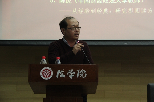 中南财经政法大学陈虎老师发言的主题为“从经验到经典:研究型阅读方法论”。陈虎老师表示,一个不能转化为口语的思想就是伪思想。为了诠释这一观点,陈虎老师现场放映了一段视频,并作出精辟总结,指出口语和深刻并非截然对立。教育是“唯上智与下愚不移”,最聪明和最笨的人都不是教育作用的对象,教育作用的对象是智能水平处于中间的人。以卢梭的《论戏剧》和《忏悔录》为例,陈虎老师指出,老师需要告诉学生问题意识从何而来,告诉学生所学理论究竟能解决哪些经验问题,为学生还原理论的经验背景。