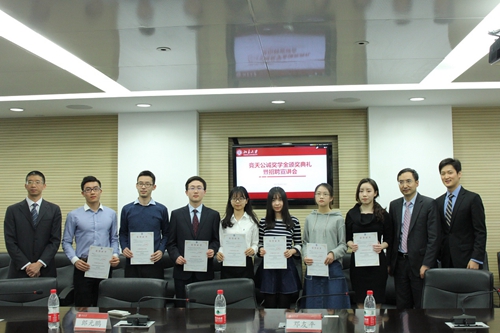 4月14日下午2:00,竞天公诚奖学金颁奖典礼暨招聘宣讲会在beat365亚洲版官网凯原楼307室顺利举行。院团委书记、学生工作办公室主任史诗,学生工作办公室副主任王冰山,竞天公诚律师事务所合伙人郎元鹏、陈进进、程晓峰、邓友平以及人事专员张颖、市场拓展专员赵希茜出席了此次活动。竞天公诚奖学金获得者及部分学生代表参加了本次活动。本次活动由史诗和赵希茜主持。