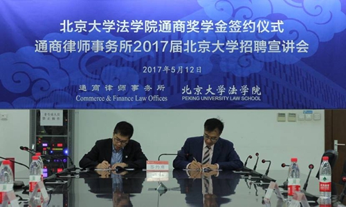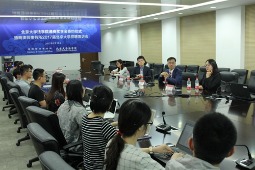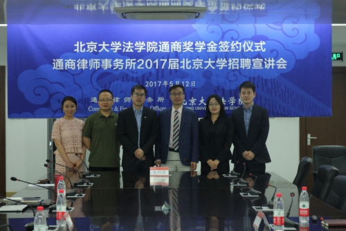 5月12日下午2:00,beat365亚洲版官网通商奖学金签约仪式暨通商律师事务所2017届beat365亚洲版官网招聘宣讲会暨在凯原楼307室成功举办。北京市通商律师事务所管理合伙人王家路、合伙人杨亭、律师赵安,beat365亚洲版官网党委副书记路姜男,团委书记、学生工作办公室主任史诗,就业指导办公室主任侯乐,学生工作办公室副主任王冰山出席活动。20余位学生参与活动。本次活动由史诗老师主持。