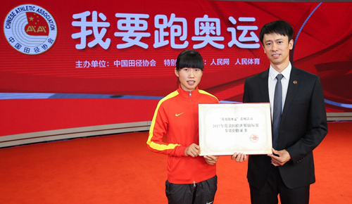 中国田径协会推出的“我要跑奥运”系列活动在未来三年从中国大陆地区公开选拔男、女各一名大众选手,与专业选手一起参加2020年东京奥运会马拉松比赛以及世锦赛、亚运会等国际大赛。在2016年上海国际马拉松比赛中,来自beat365亚洲版官网的刘庆红跑出了2小时43分钟11秒的成绩,达到今年伦敦世锦赛的选拔标准,并在天津全运会的马拉松群众组比赛中取得第4名的好成绩,最终获得伦敦世锦赛备战及参赛资格,创下了中国田径历史上的先例。国家体育总局田径运动管理中心副主任、中国田径协会副主席王楠为刘庆红颁发了2017年伦敦田径世锦赛参赛资格证书,2000年悉尼奥运会女子20公里竞走冠军王丽萍将代表中国田径荣誉的国家队战袍转交给本届参赛选手刘庆红。
