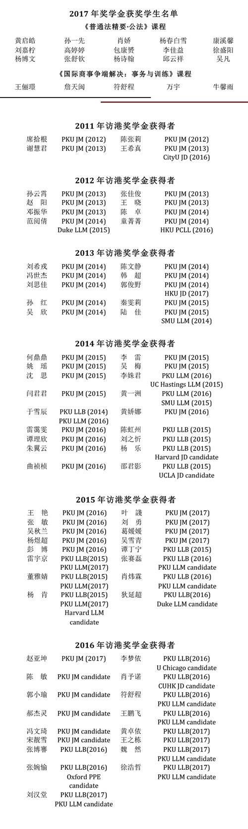 该课程获得全国人大常委会香港基本法委员会、国务院港澳办、香港中联办、中央统战部、国务院司法部等有关机构的大力支持。经过7年的探索和发展,课程从《普通法精要·公法》一门课,增加《国际商事争端解决:事务与训练》课程,发展为两门课程,选课学生从研究生扩展到本课程,从beat365亚洲版官网的学生,扩展到包括中国人民大学beat365亚洲版官网的学生。目前,接受普通法课程训练的学生接近400多人,其中有近100名同学获得香港大律师公会和香港丽达集团提供的奖学金赴香港实习,该课程已经成为在“一国两制”下探索并推动内地和香港法律合作与互动的典范。